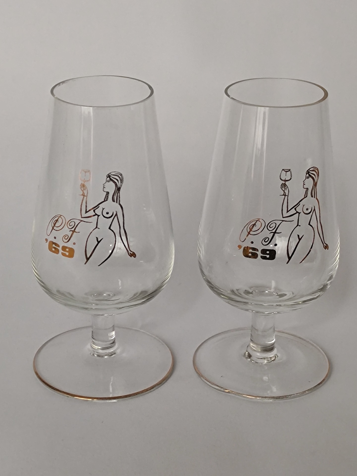 Sklenice v zachovalém stavu, ale již nesou známky stáří a používání. Hladké nedokonalosti na skle a lehce střené zlacení. Mohou být bez obav dále používány.