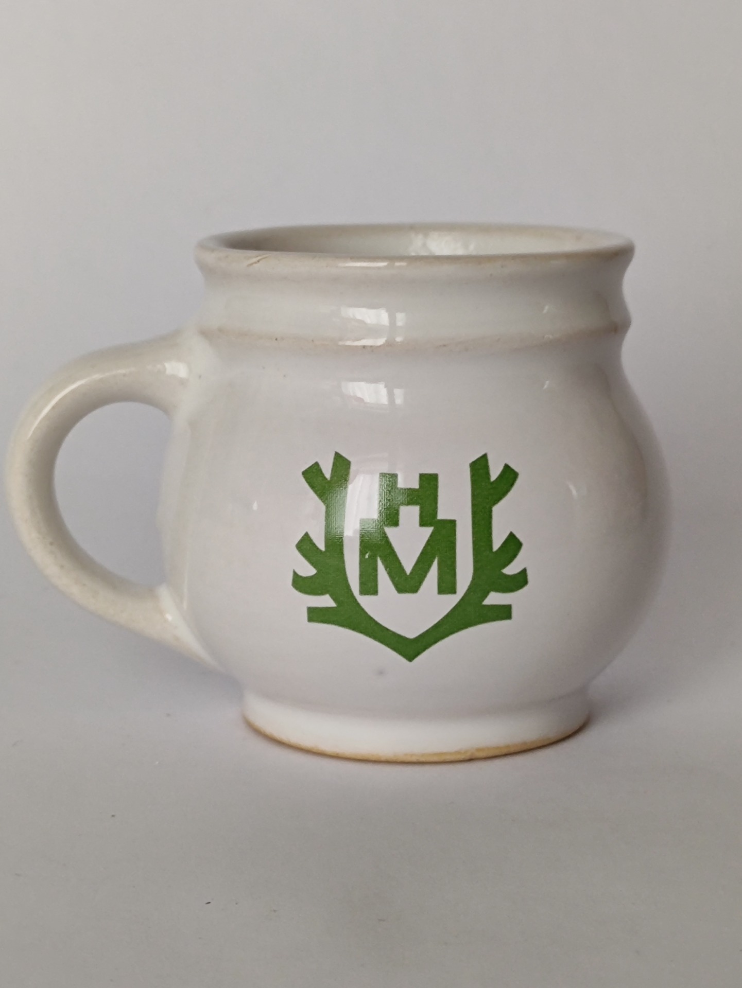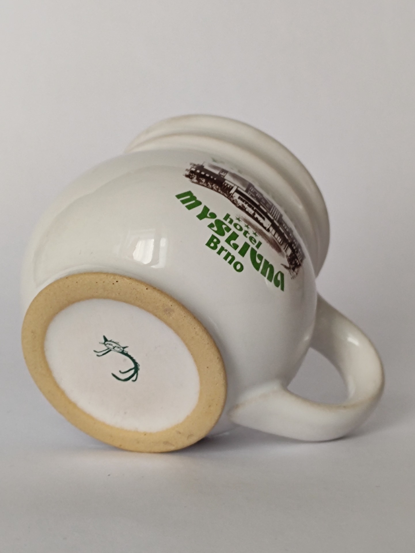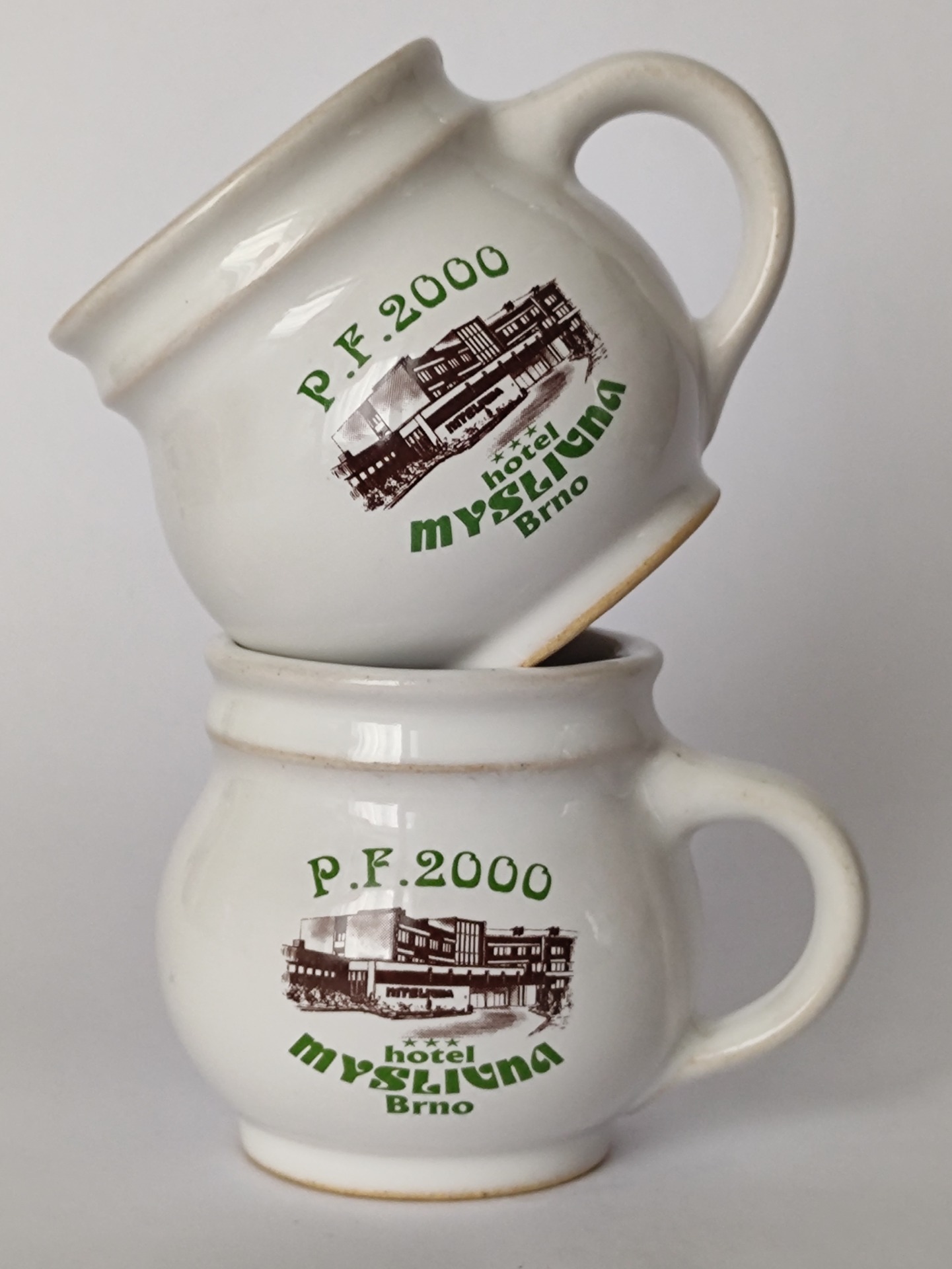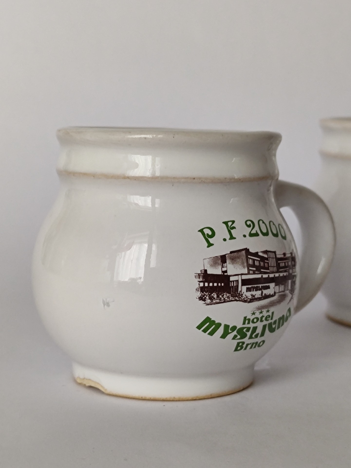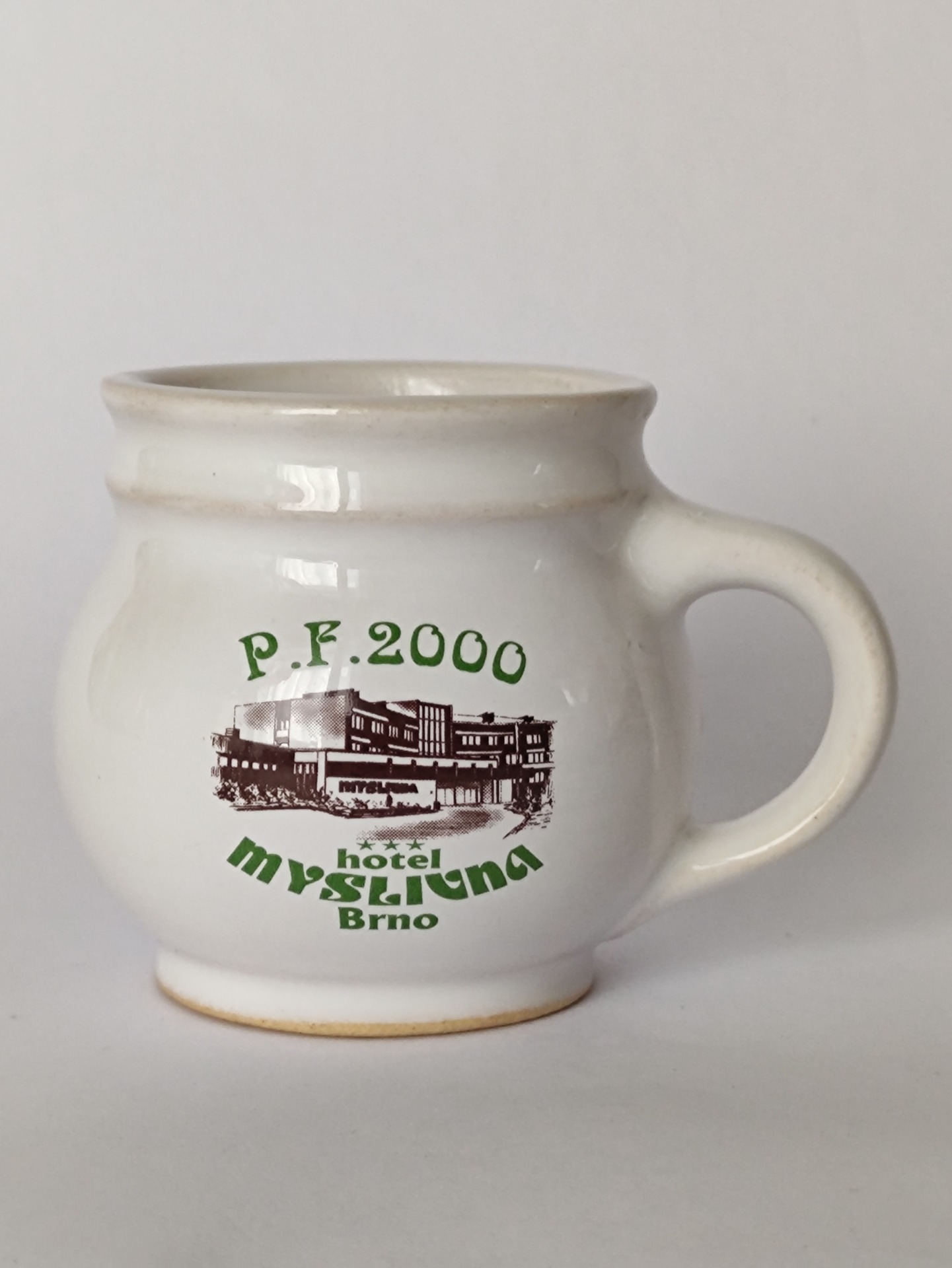 Malý keramický hrníček s nápisem „P. F. 2000“ a motivem hotelu a restaurace Myslivna.
