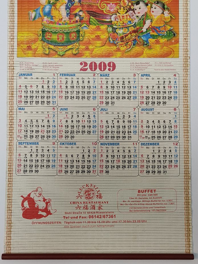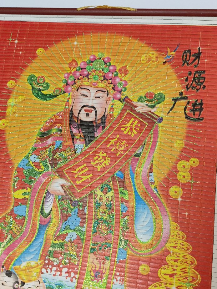Nástěnný kalendář v tradičním asijském stylu, vyrobený jako reklamní dekorace pro čínskou restauraci. Hlavním motivem je bůh prosperity a hojnosti, symbol štěstí, bohatství a úspěchu. Možná už teď čeká, až rozzáří váš interiér.