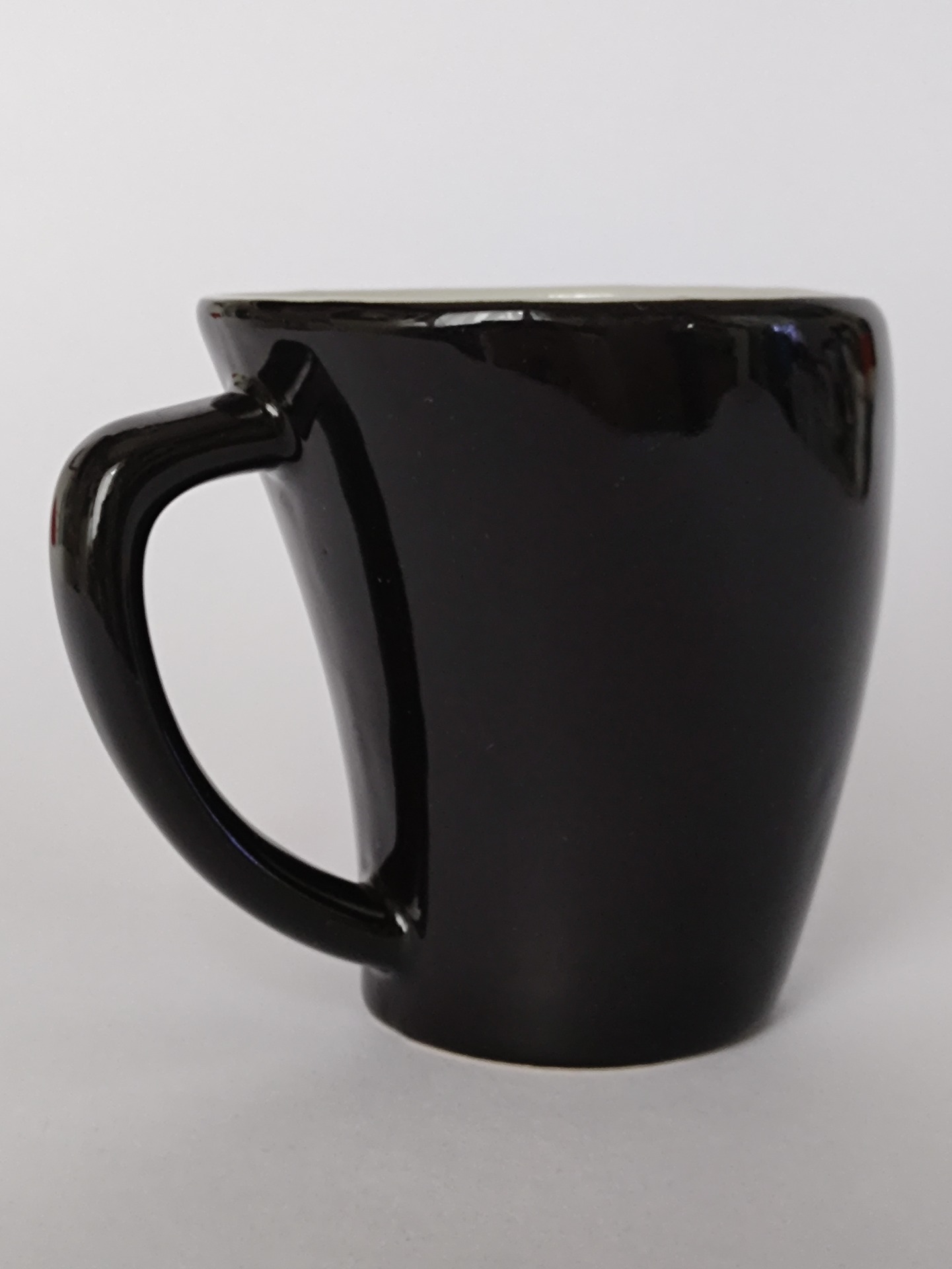Asymetrický hrníček v zachovalém stavu s menšími známkami stáří.