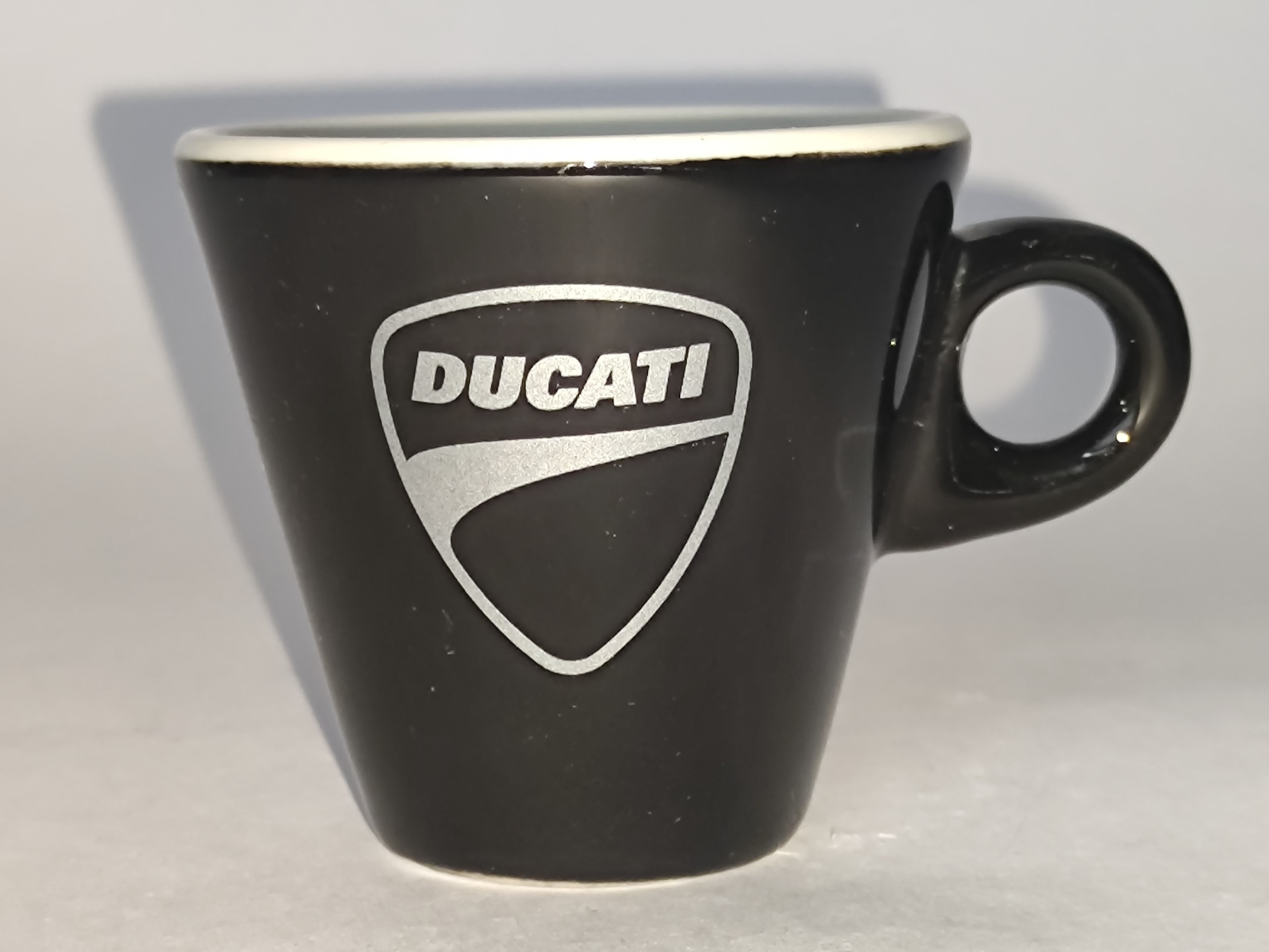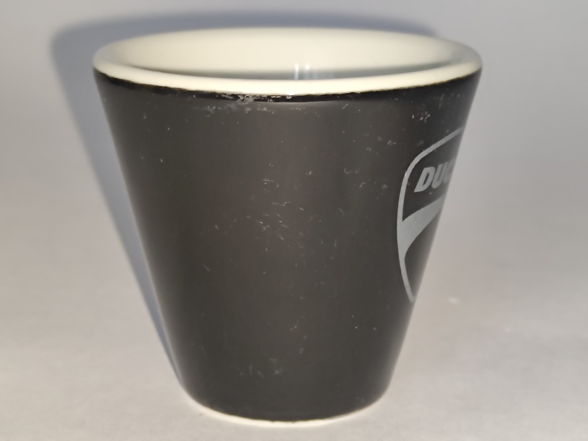 Černý šálek o objemu cca 50ml, výška 6cm. Pozor - hlavně pri umělém osvětlení jsou na povrchu z vnější strany patrné známky stáří a používání, viz fotky s bleskem. Otlučený ani jinak poškozený není, podšálek je v pořádku.
