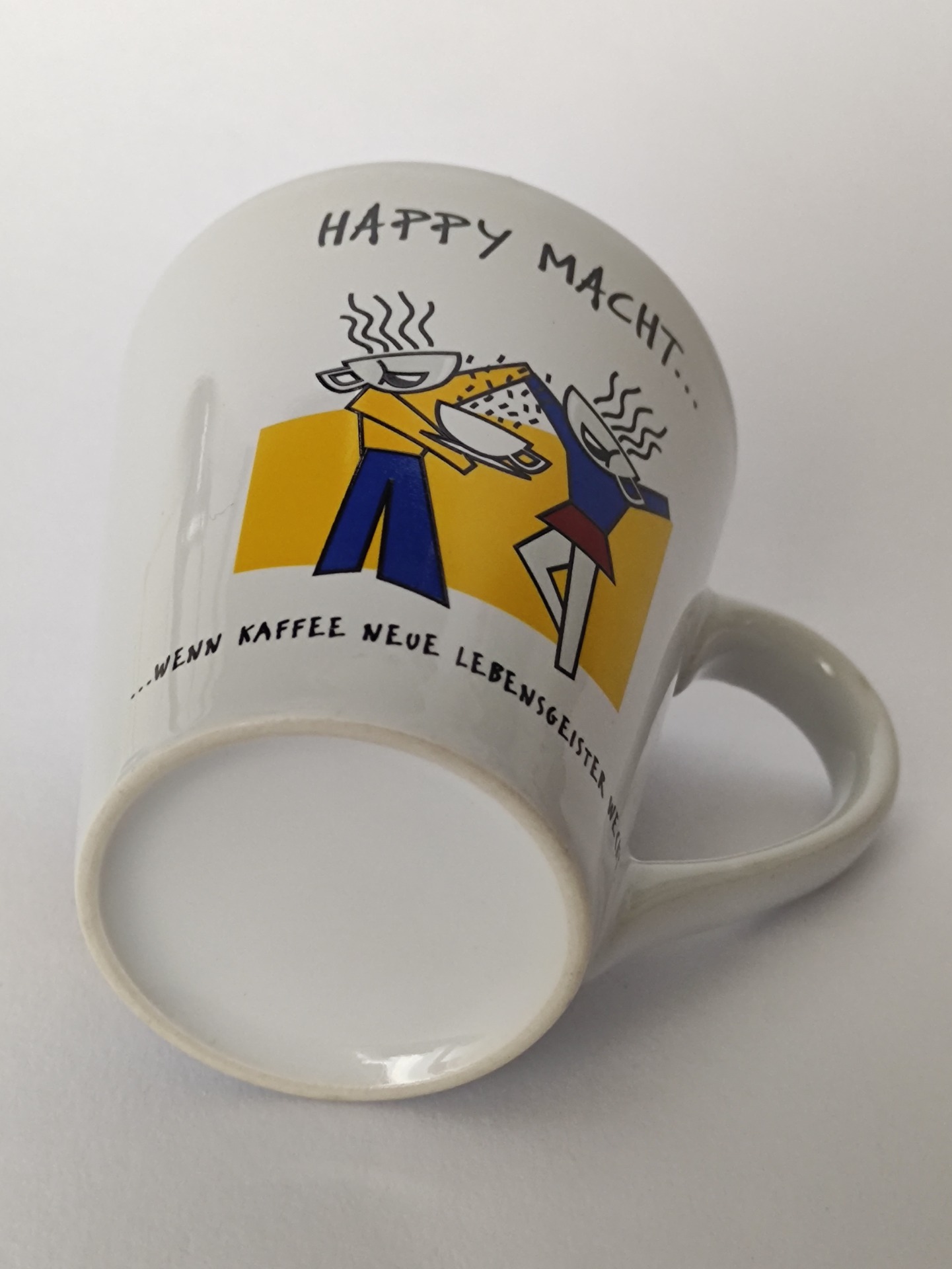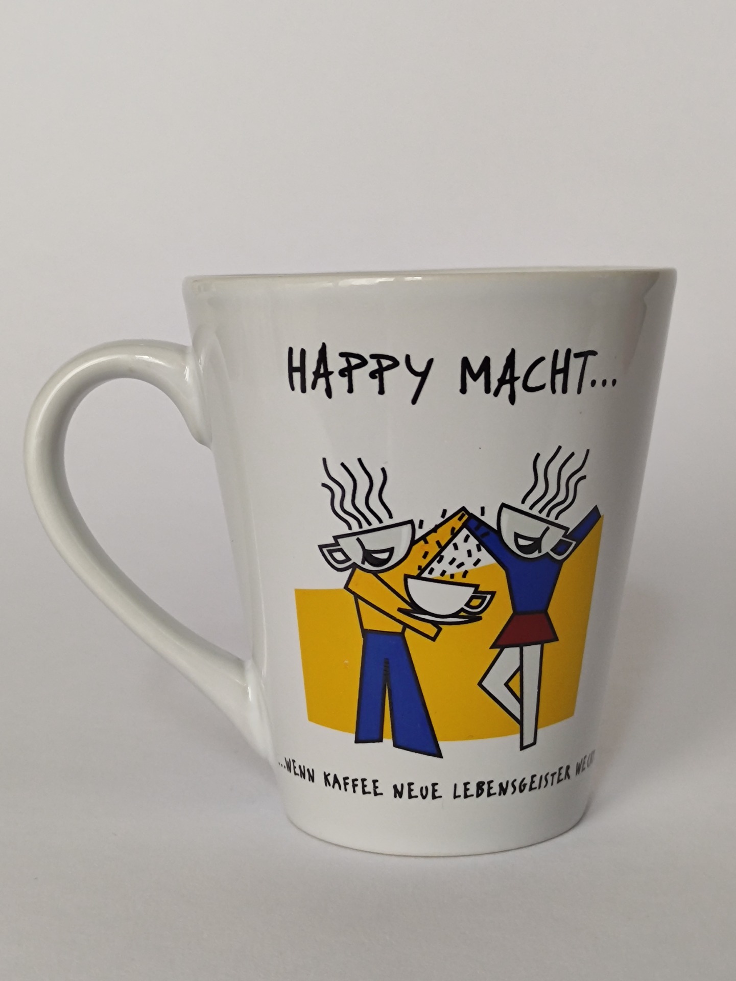 Veselý hrníček s nápisem, volně přeloženo, Štěstí dělá... když káva probouzí novou životní sílu.