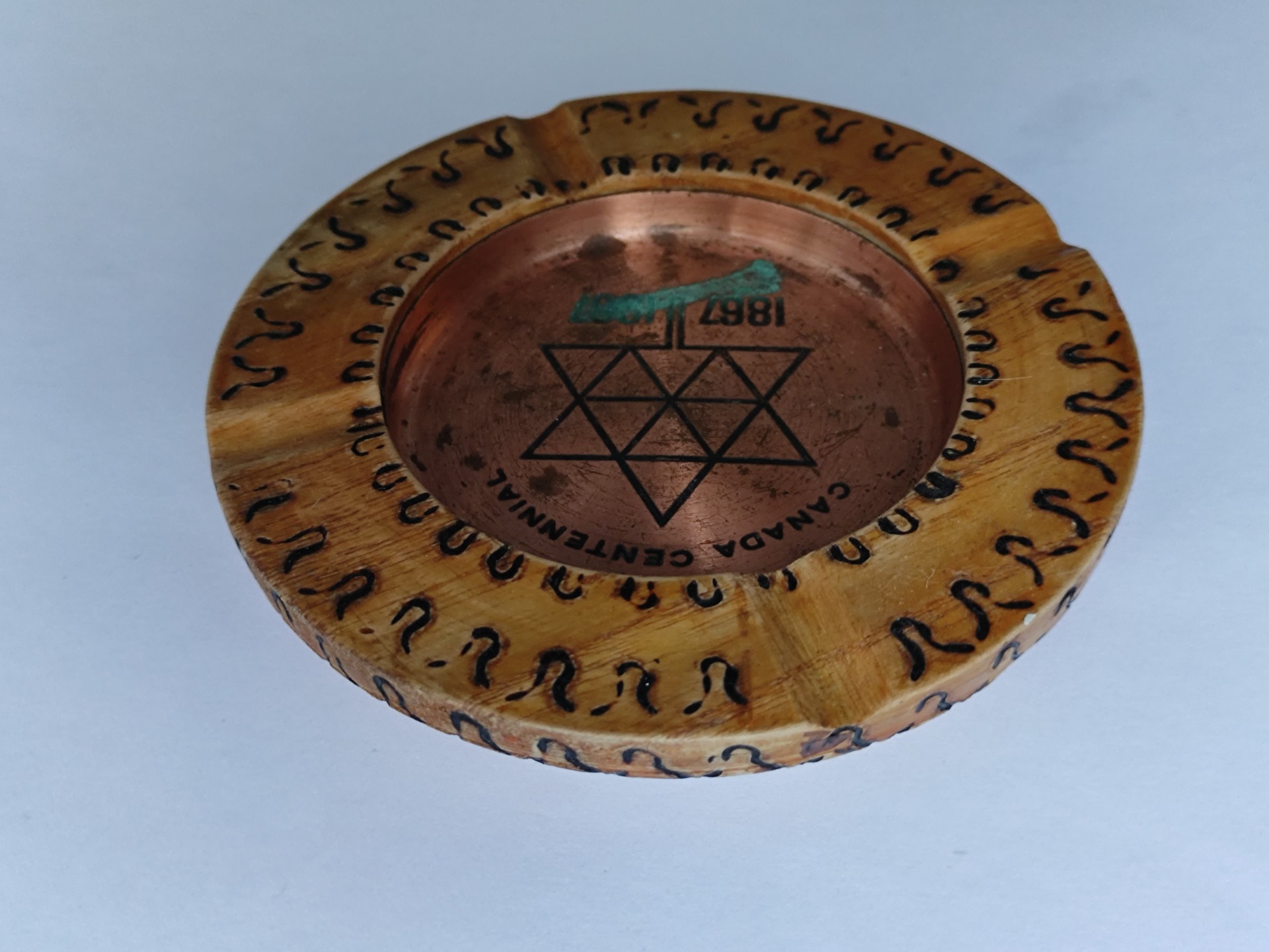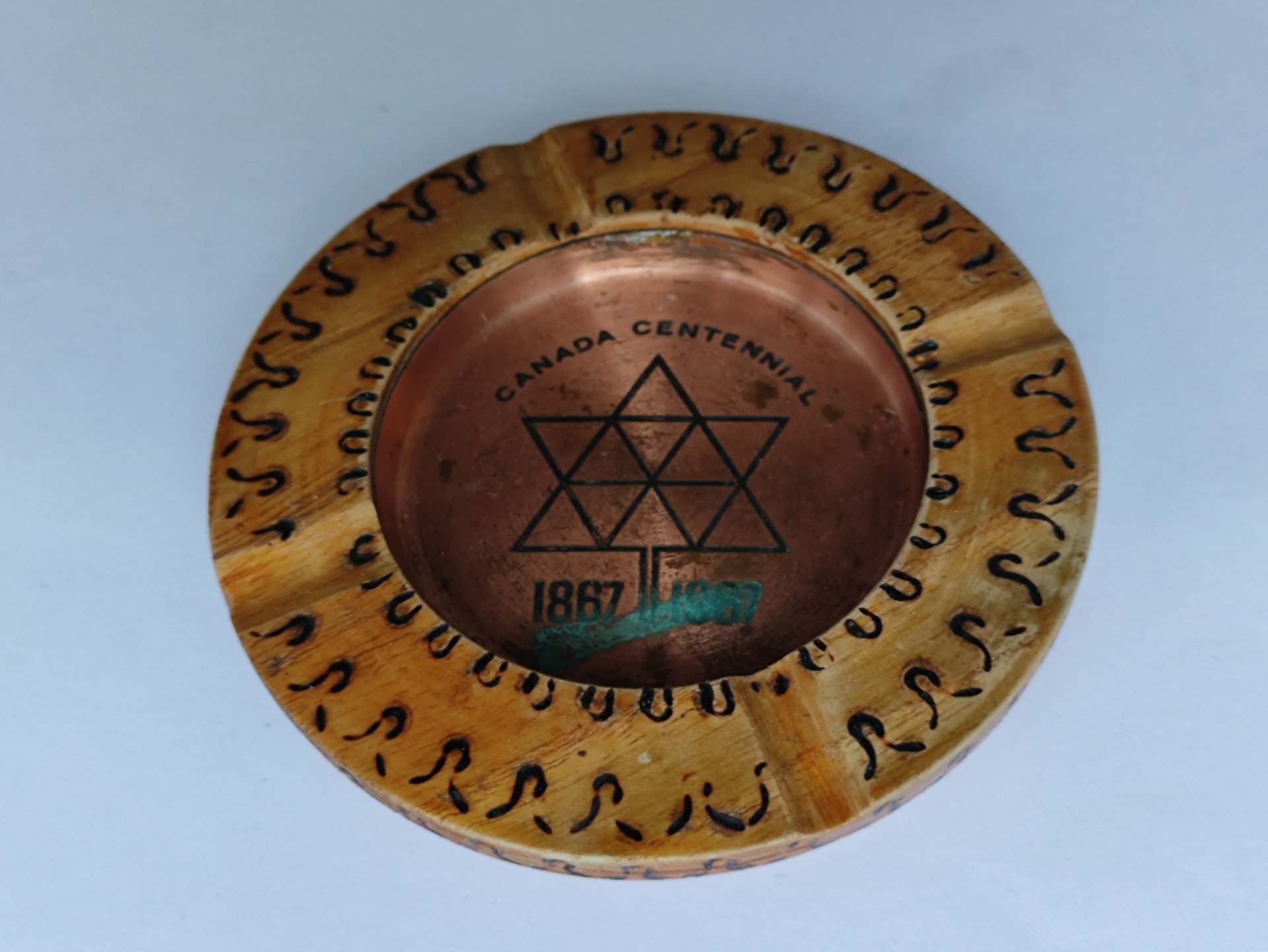 Pamětní popelník Canadian Centennial 1867–1967, vyrobený u příležitosti stého výročí Kanady, kombinuje dřevo s kovovým středem, na kterém je nápis a logo.