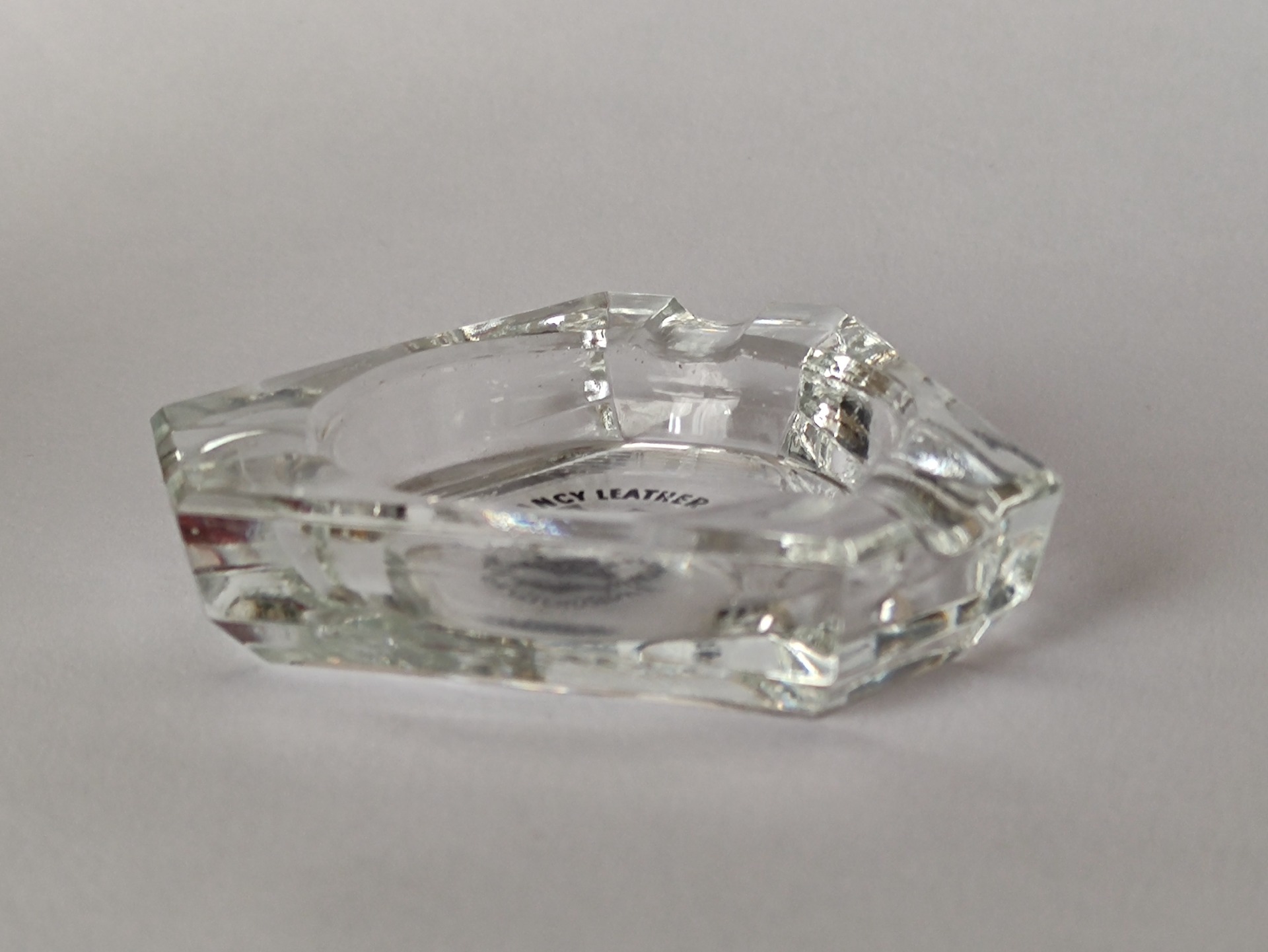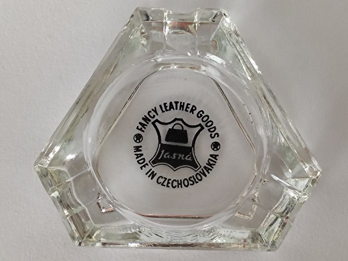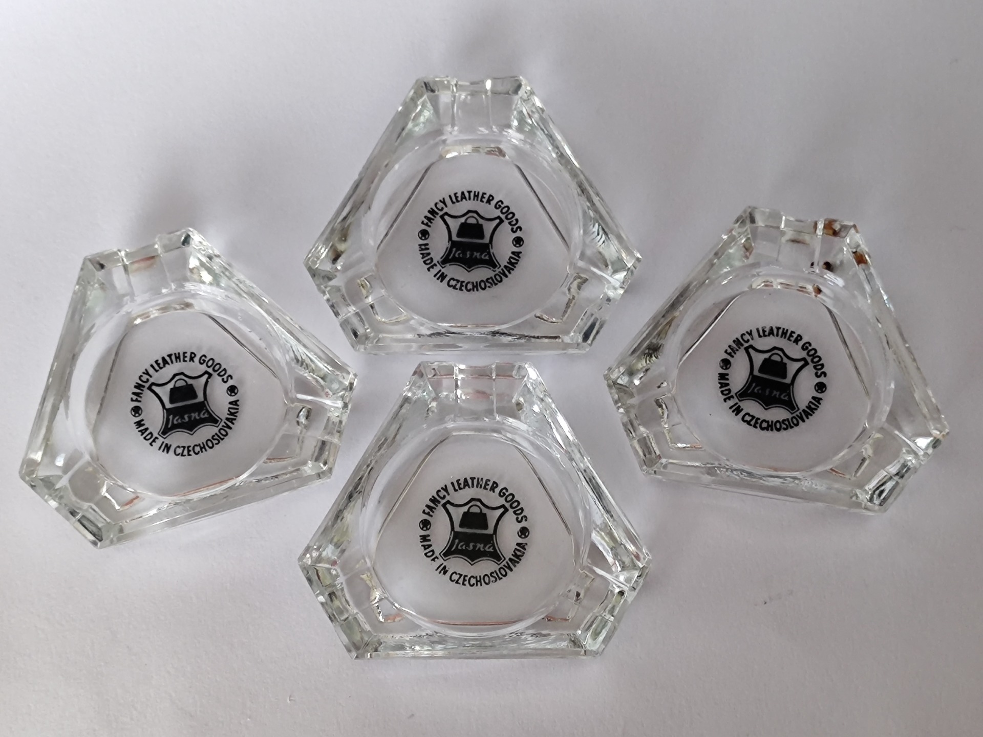 Malé skleněné popelníky z čirého skla. Nesou běžné známky staří, viditelné hlavně na potisku, který je choulostivý a věkem utrpěl.
