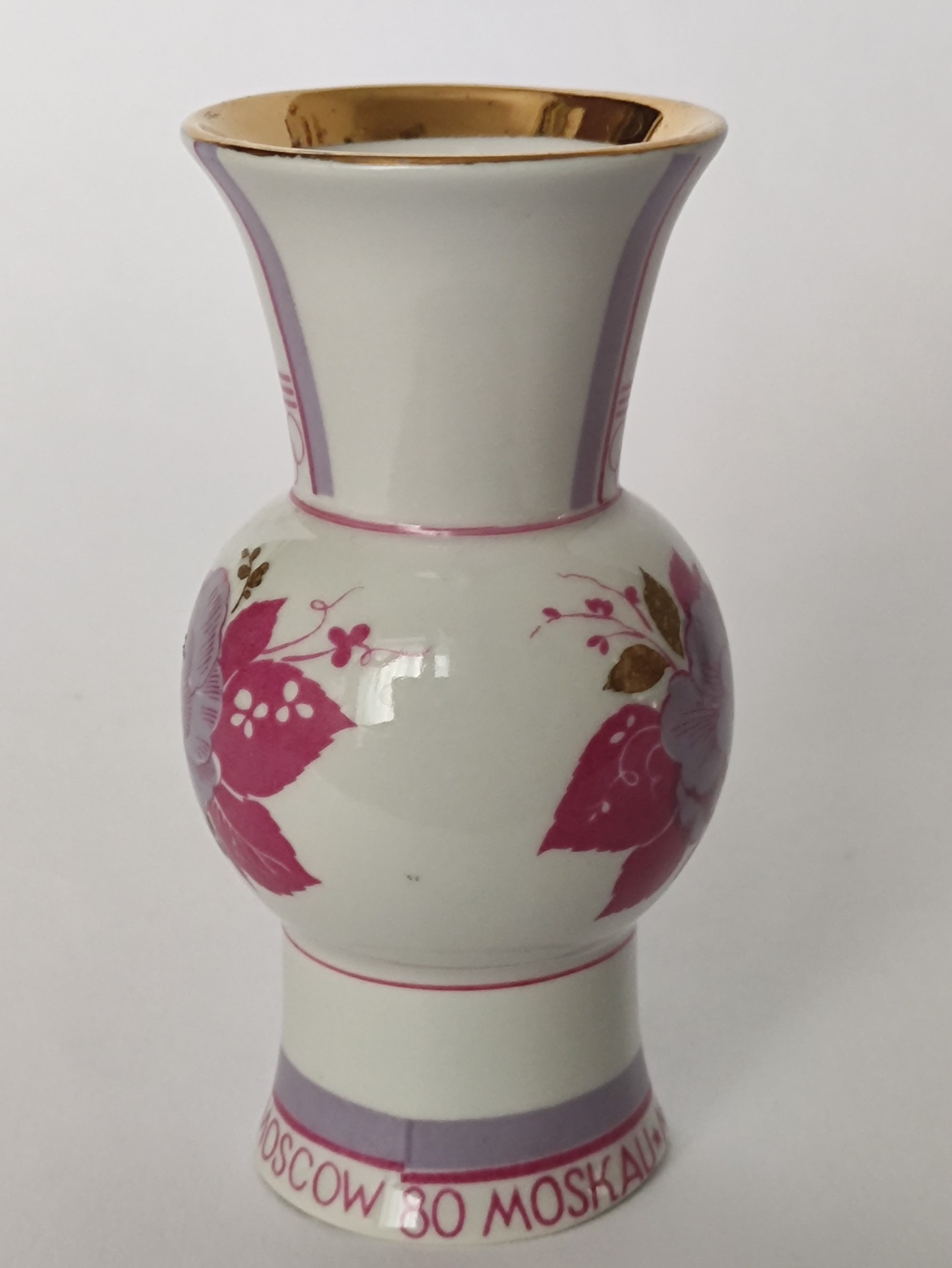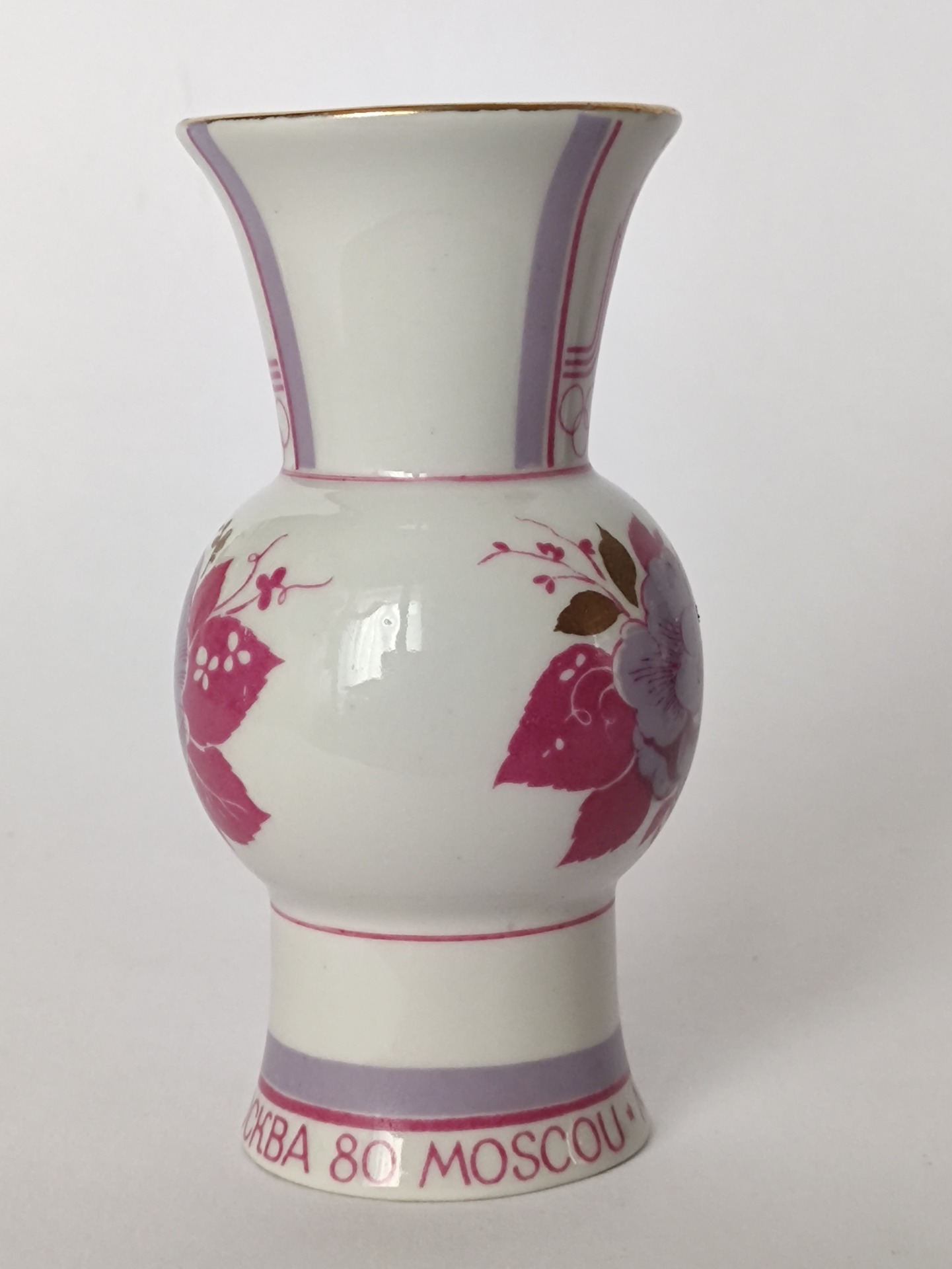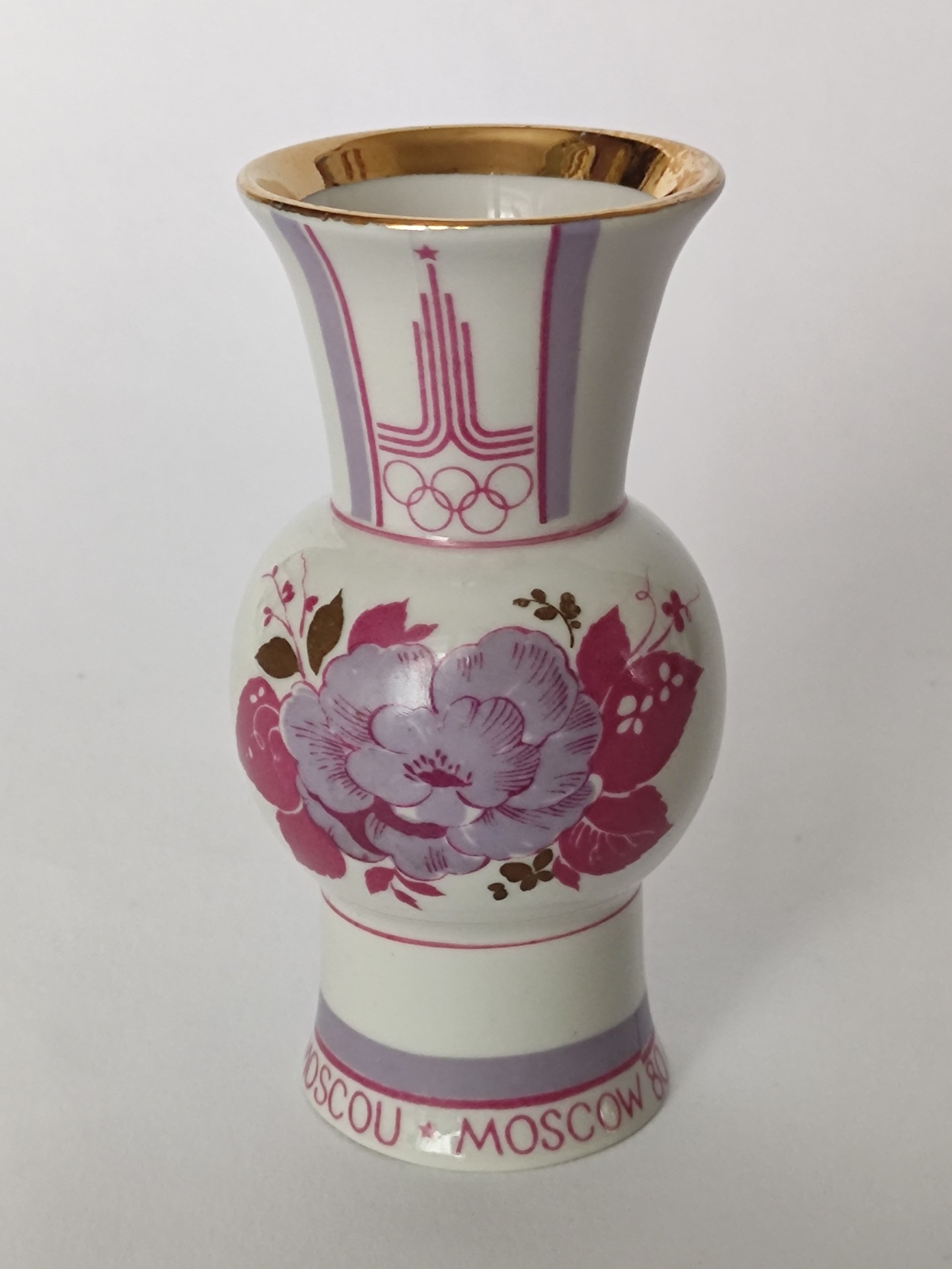 Váza kombinuje klasickou eleganci bílého porcelánu s dobovou estetikou. Dominantou je detailní květinový motiv v růžových a fialových tónech, doplněný o zlacení. Hrdlo zdobí ikonický olympijský emblém se stylizovanými liniemi a pěti kruhy. Spodní lem nese dvoujazyčný nápis MOSKAU - MOCKBA 80.