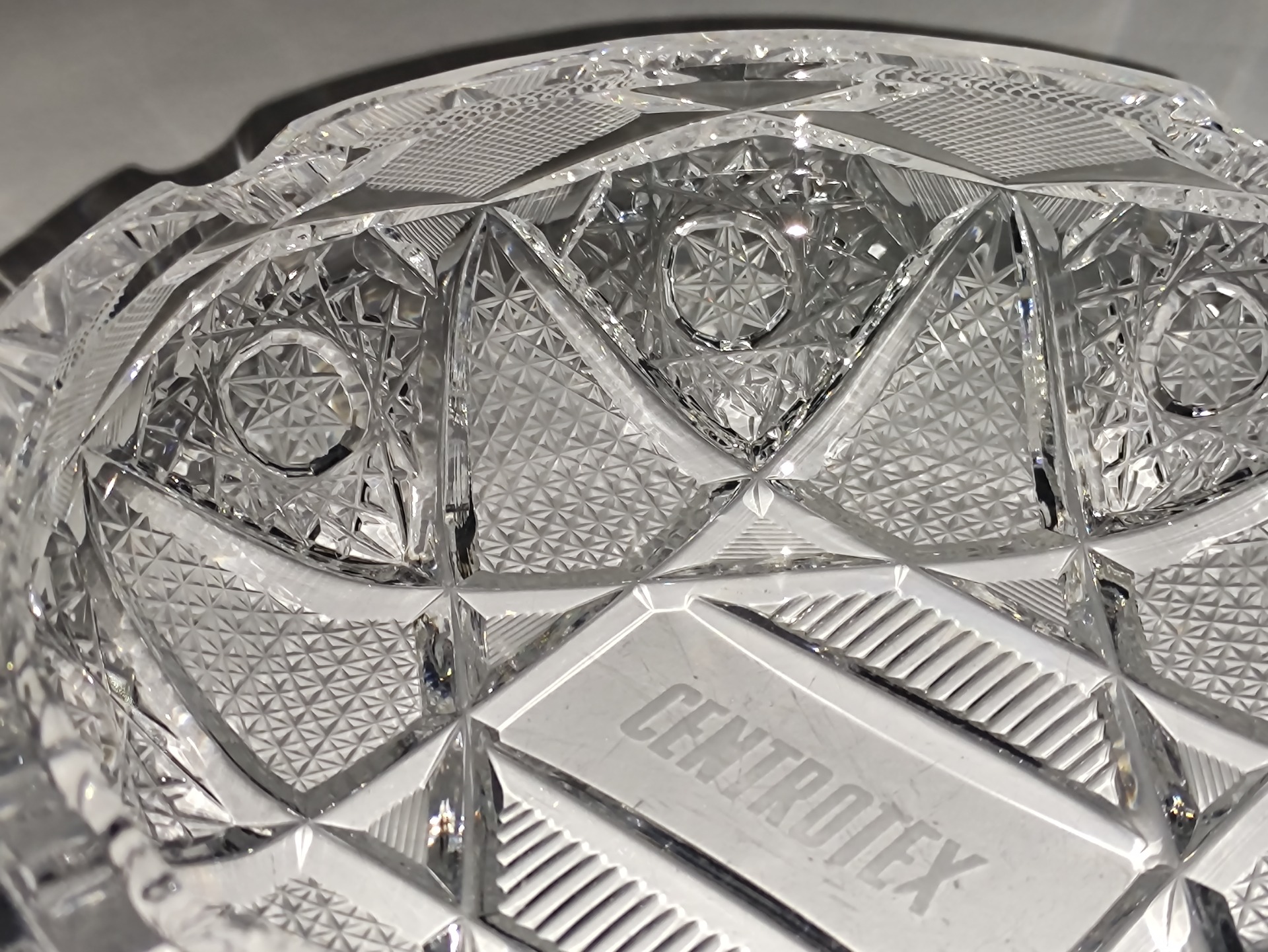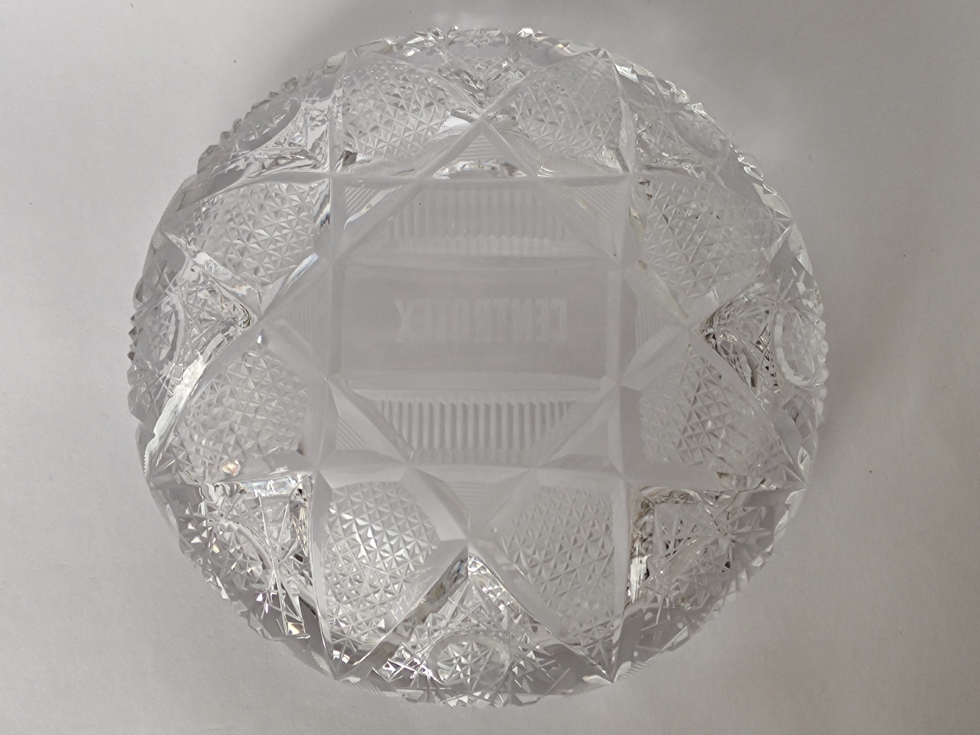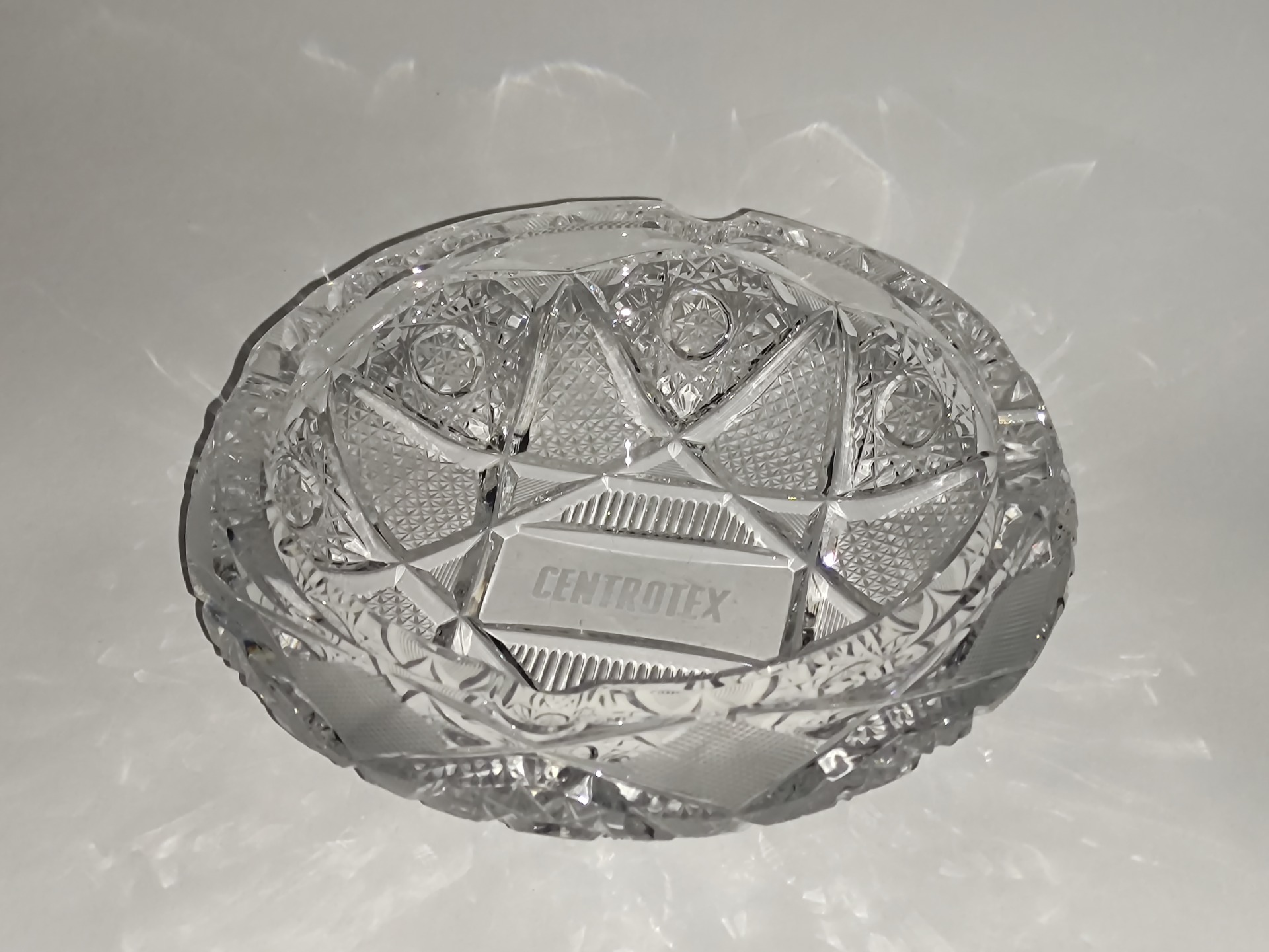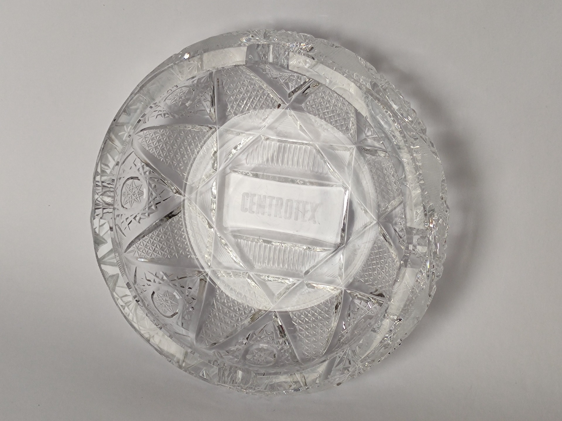 Tento těžký broušený popelník s nápisem „Centrotex“ je typickým reklamním předmětem z dob minulých, kdy podniky propagovaly své značky i prostřednictvím tradičního československého skla.