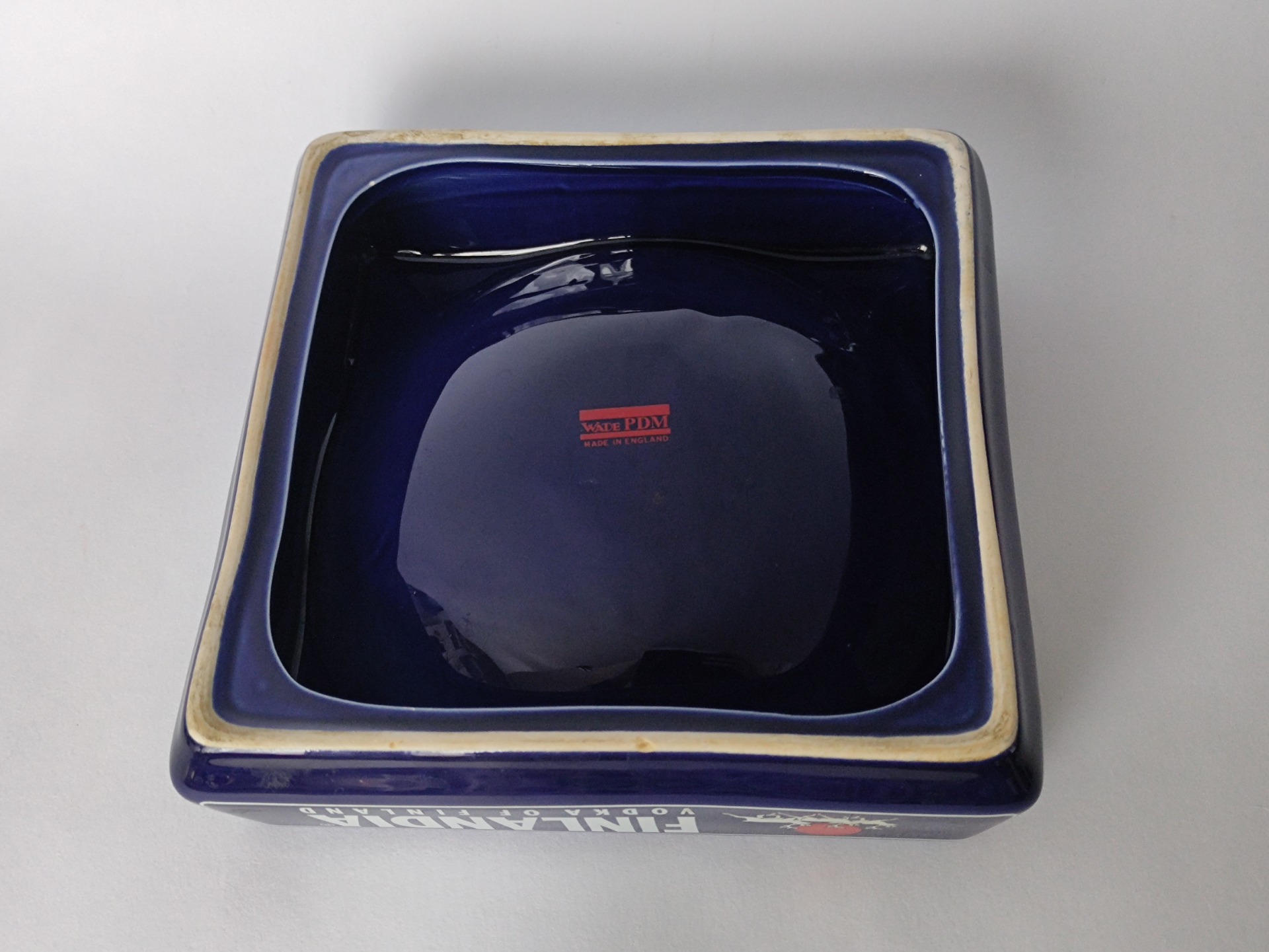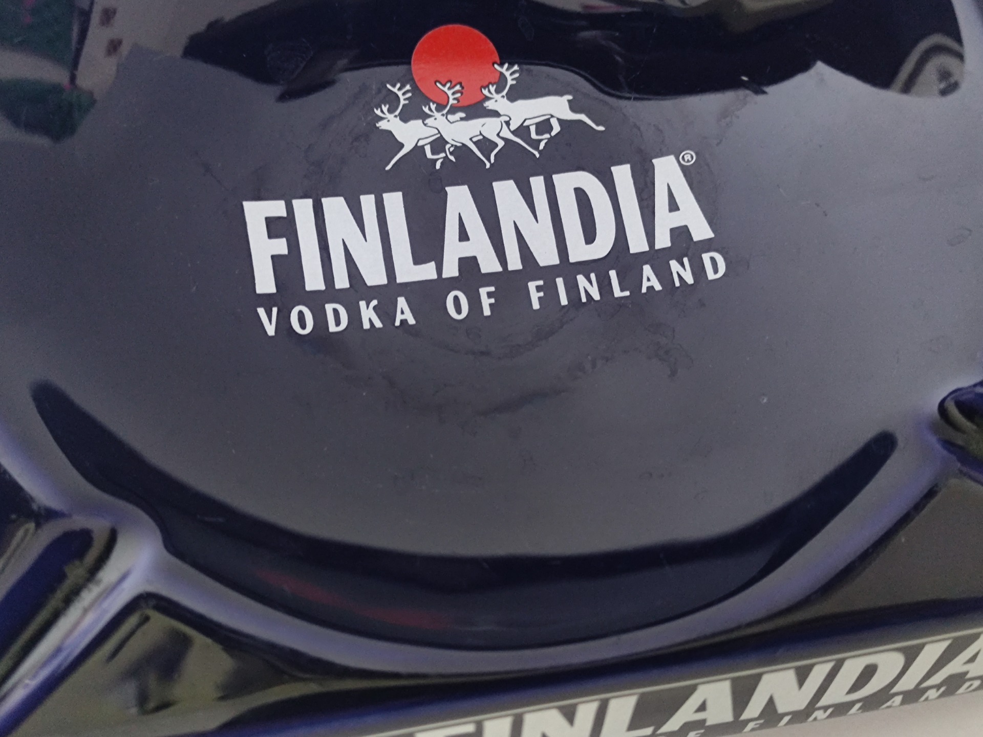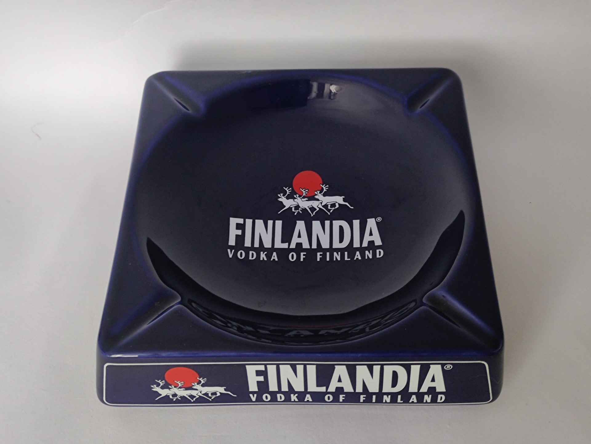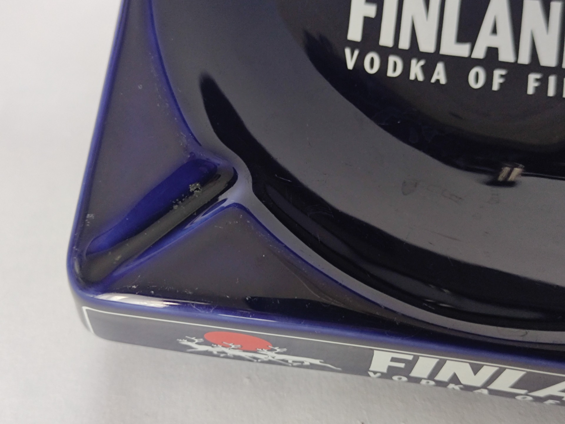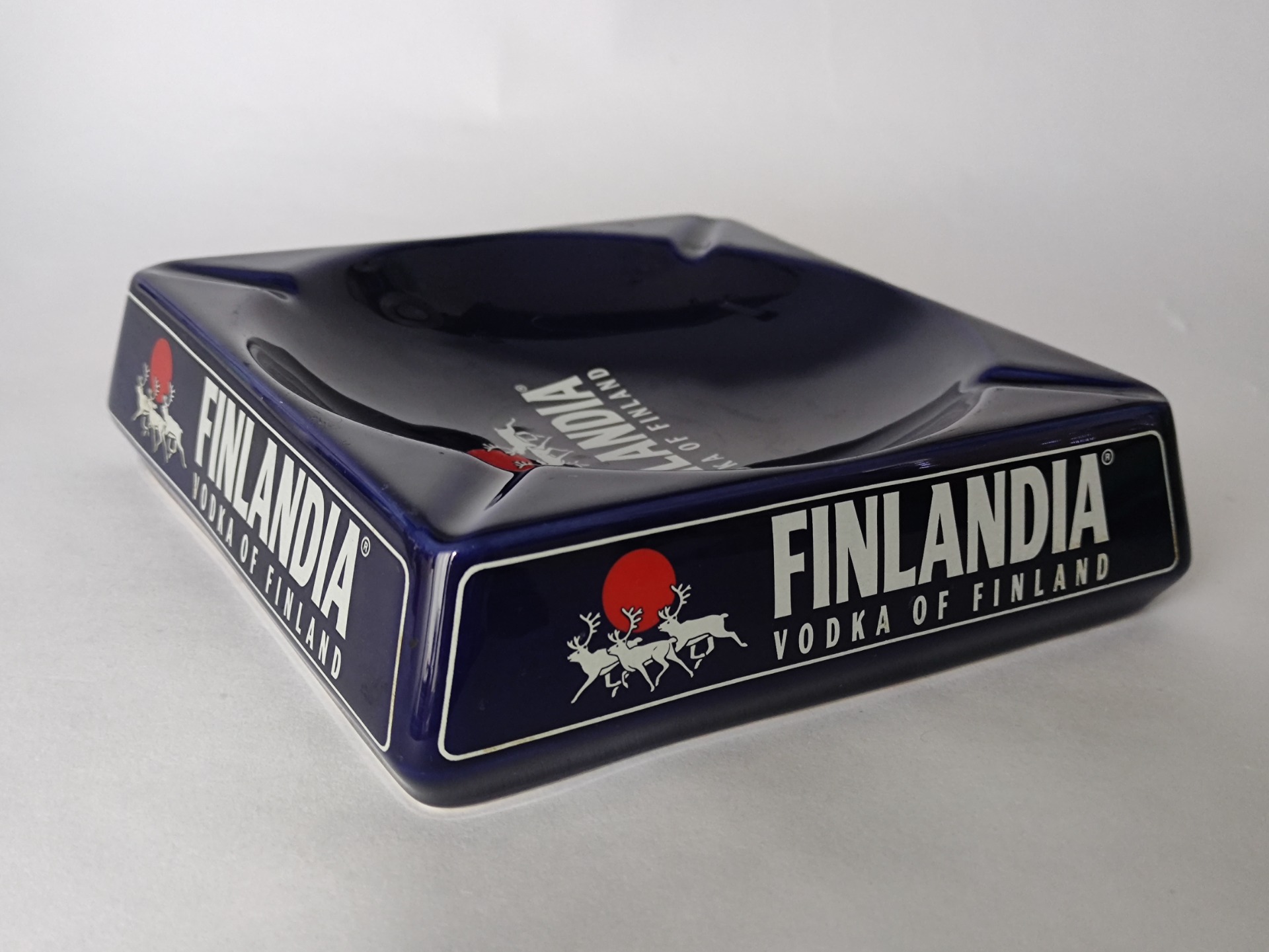 Starý reklamní popelník FINLANDIA tmavě modré barvy, originální sběratelský kousek s výrazným logem.