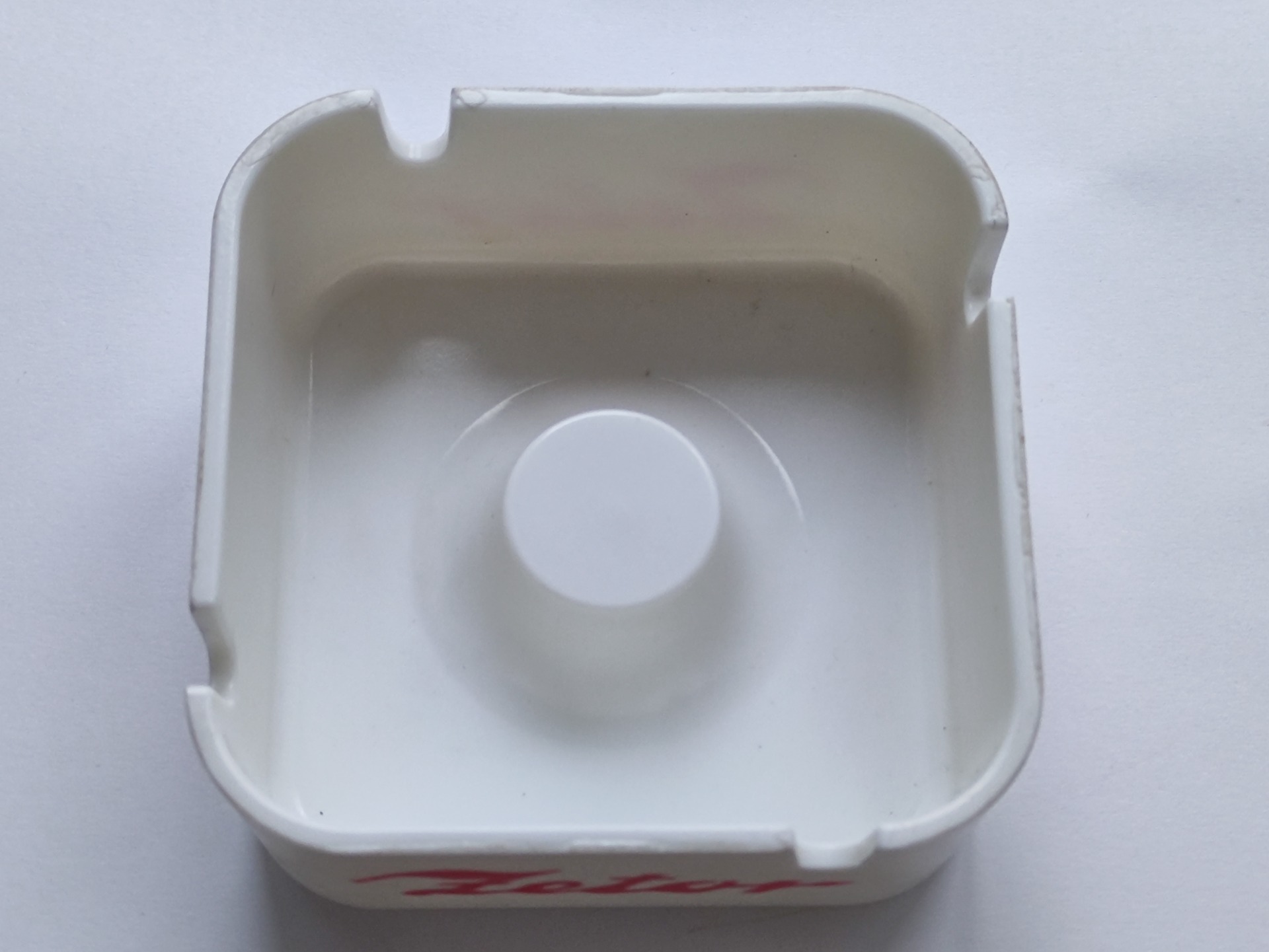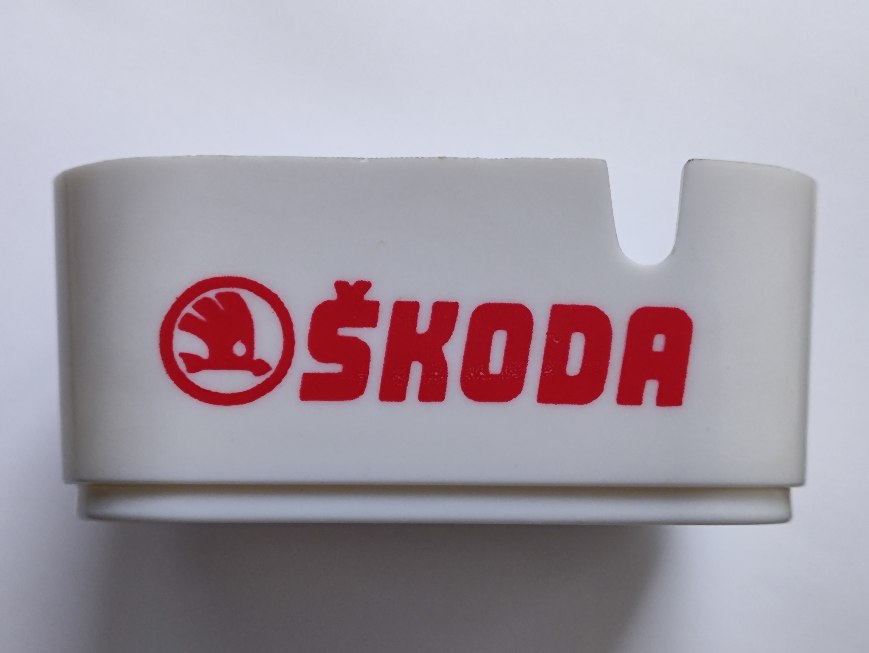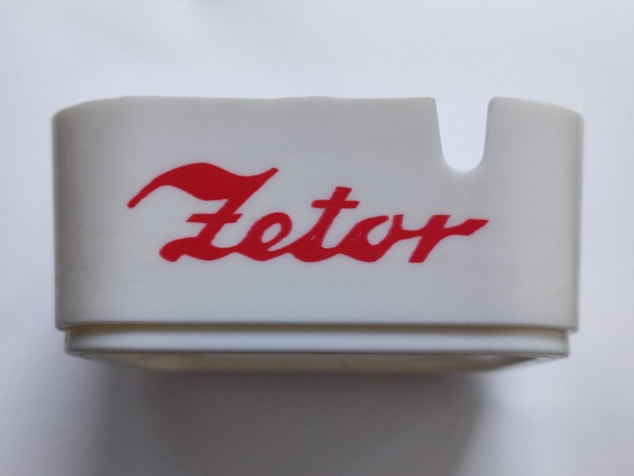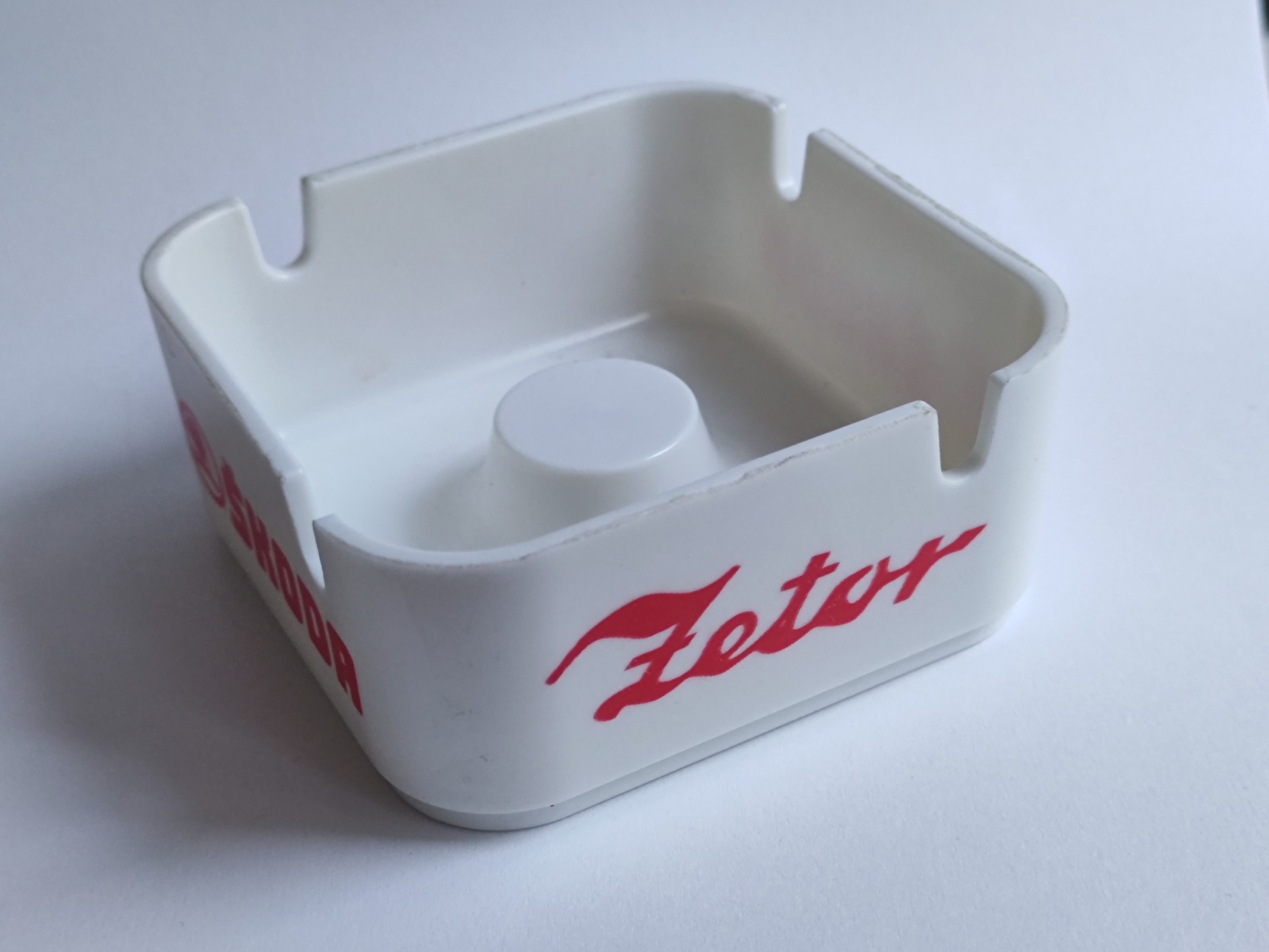 Retro plastový popelník s dobovou reklamou Zetor a ŠKODA. Sběratelský reklamní popelník z éry Československa, ideální pro fanoušky automobilů, traktorů i historické reklamy.