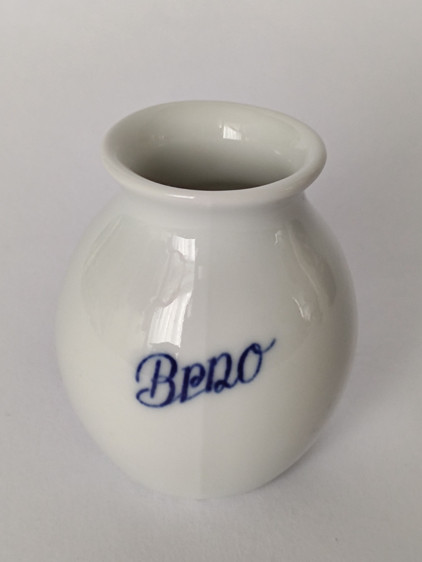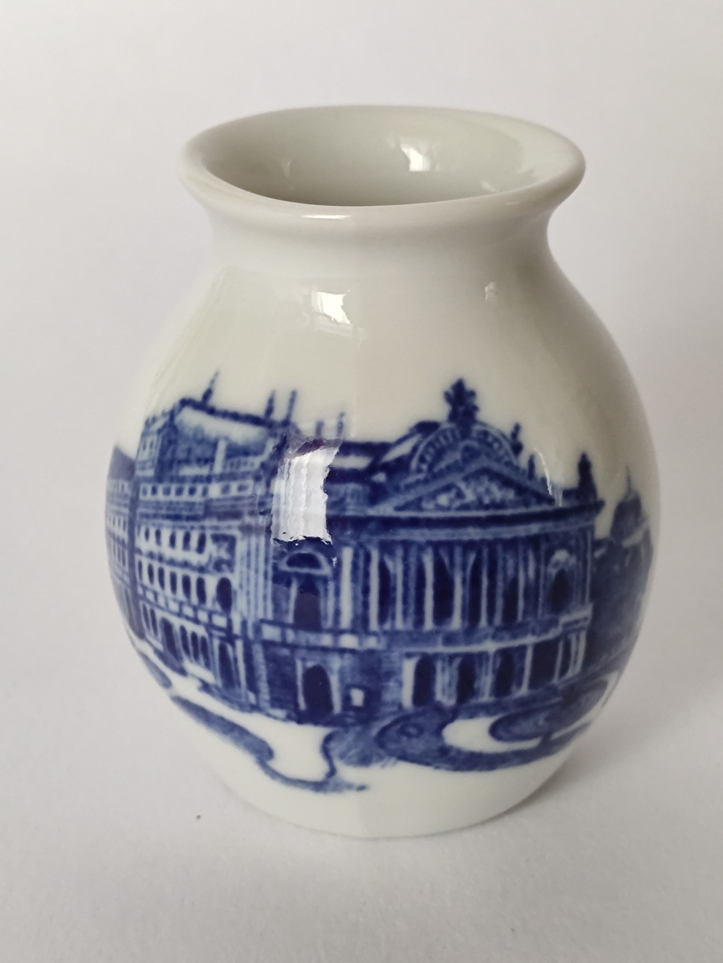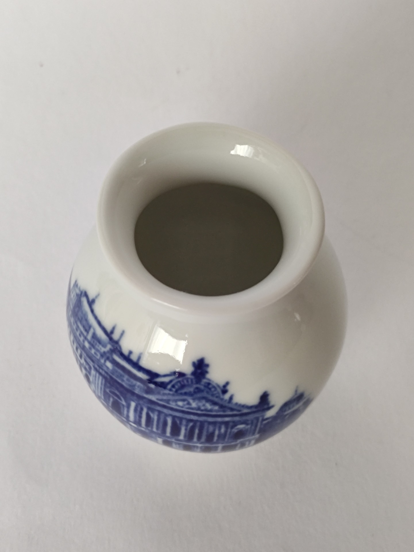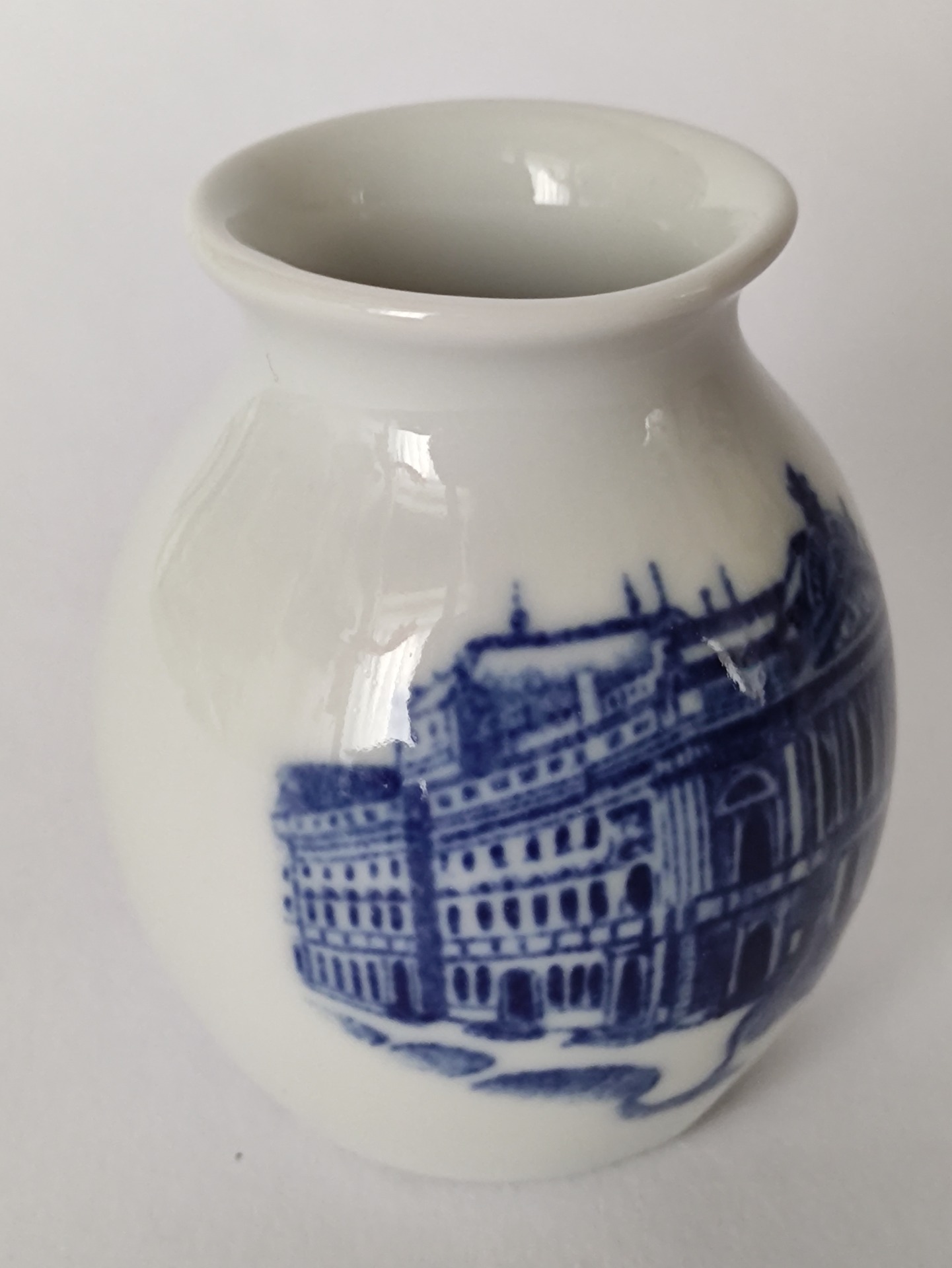 Tato drobná porcelánová vázička je klasickým příkladem kvalitní československé výroby. Na jedné straně ji zdobí detailní modrý potisk Mahenova divadla v Brně, jedné z nejkrásnějších novorenesančních budov ve střední Evropě. Druhá strana je opatřena nápisem "Brno".