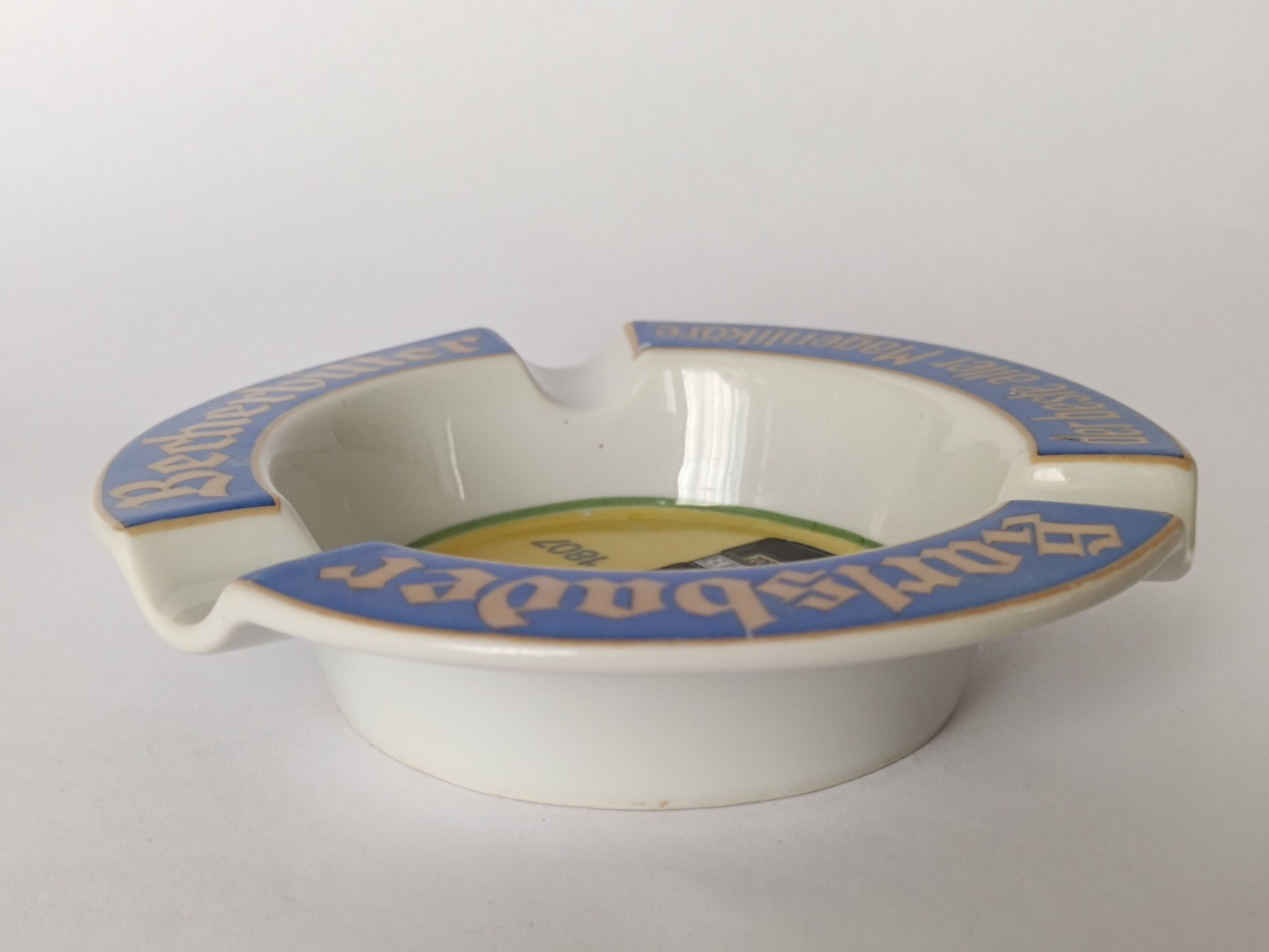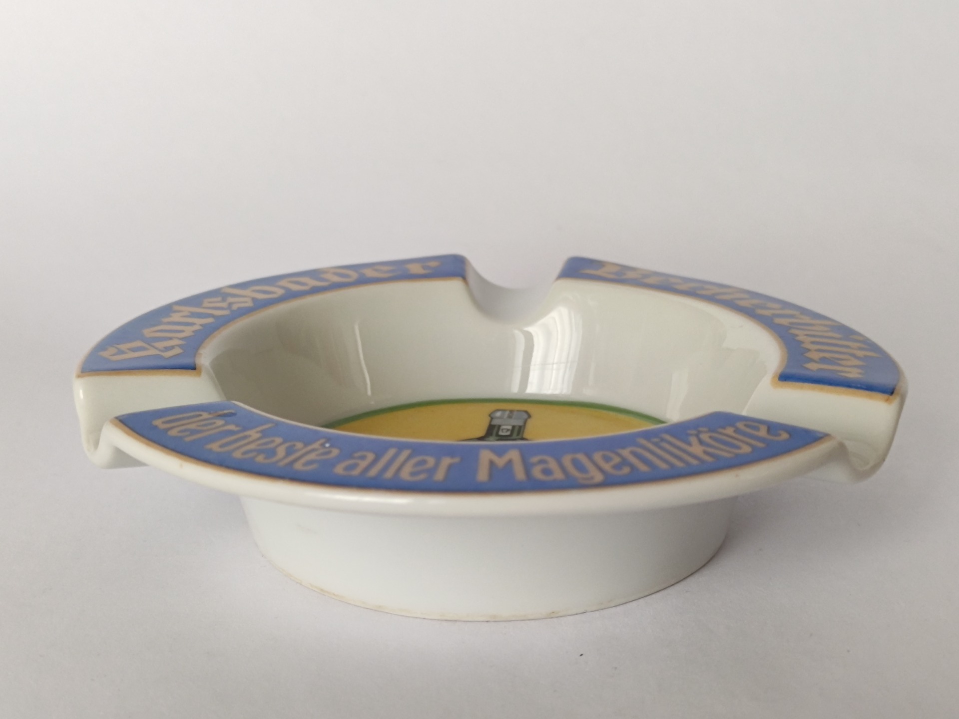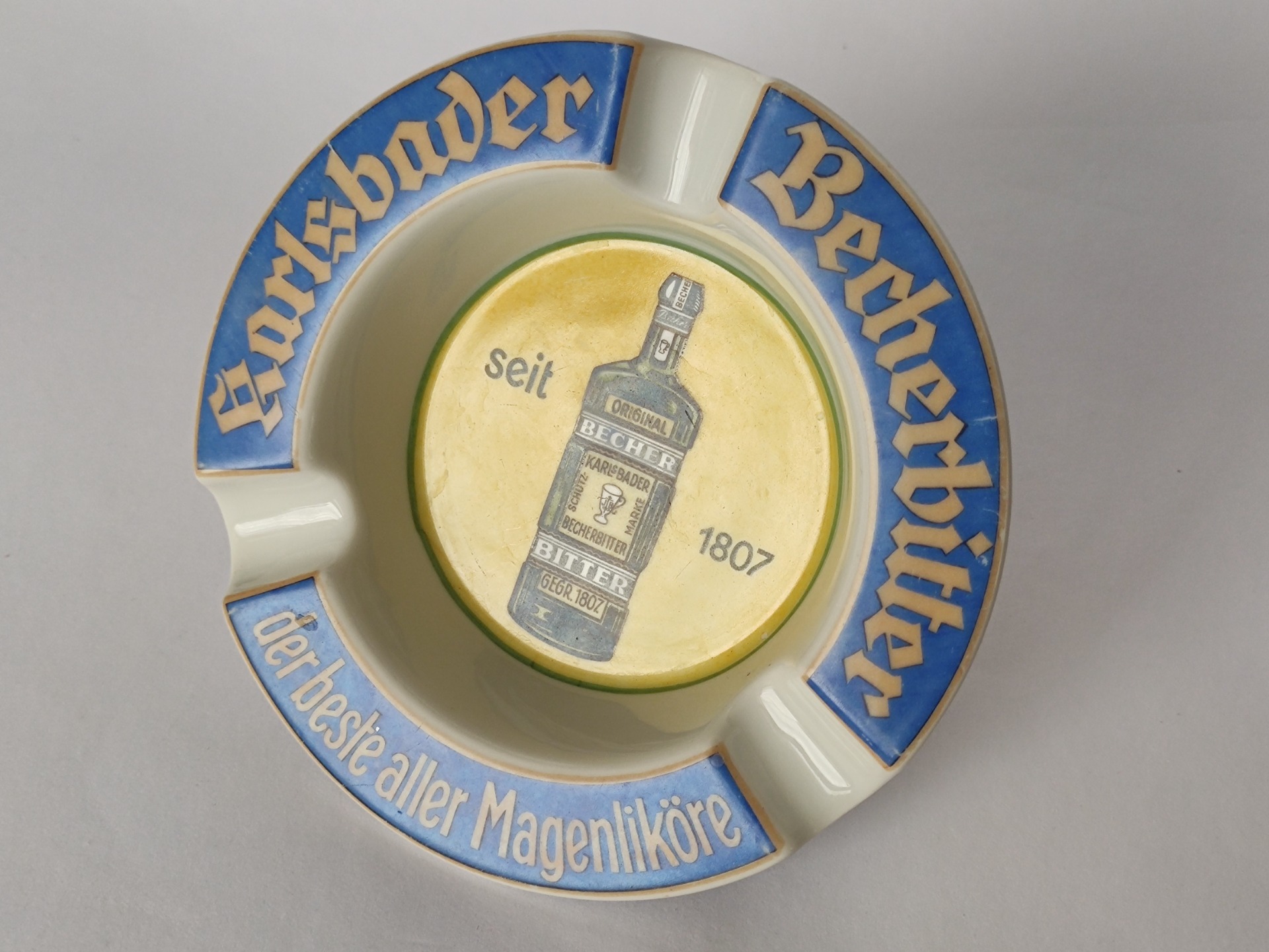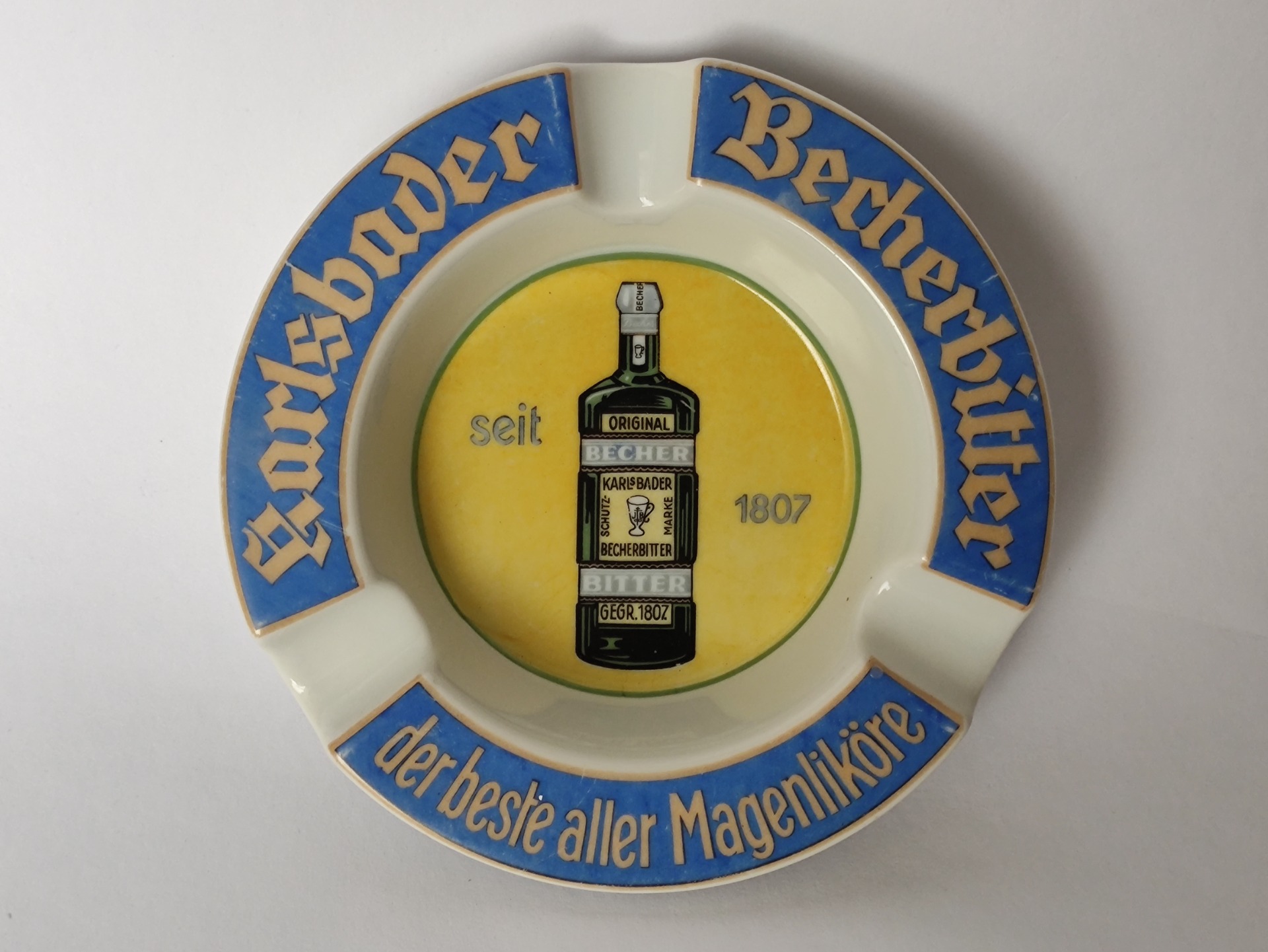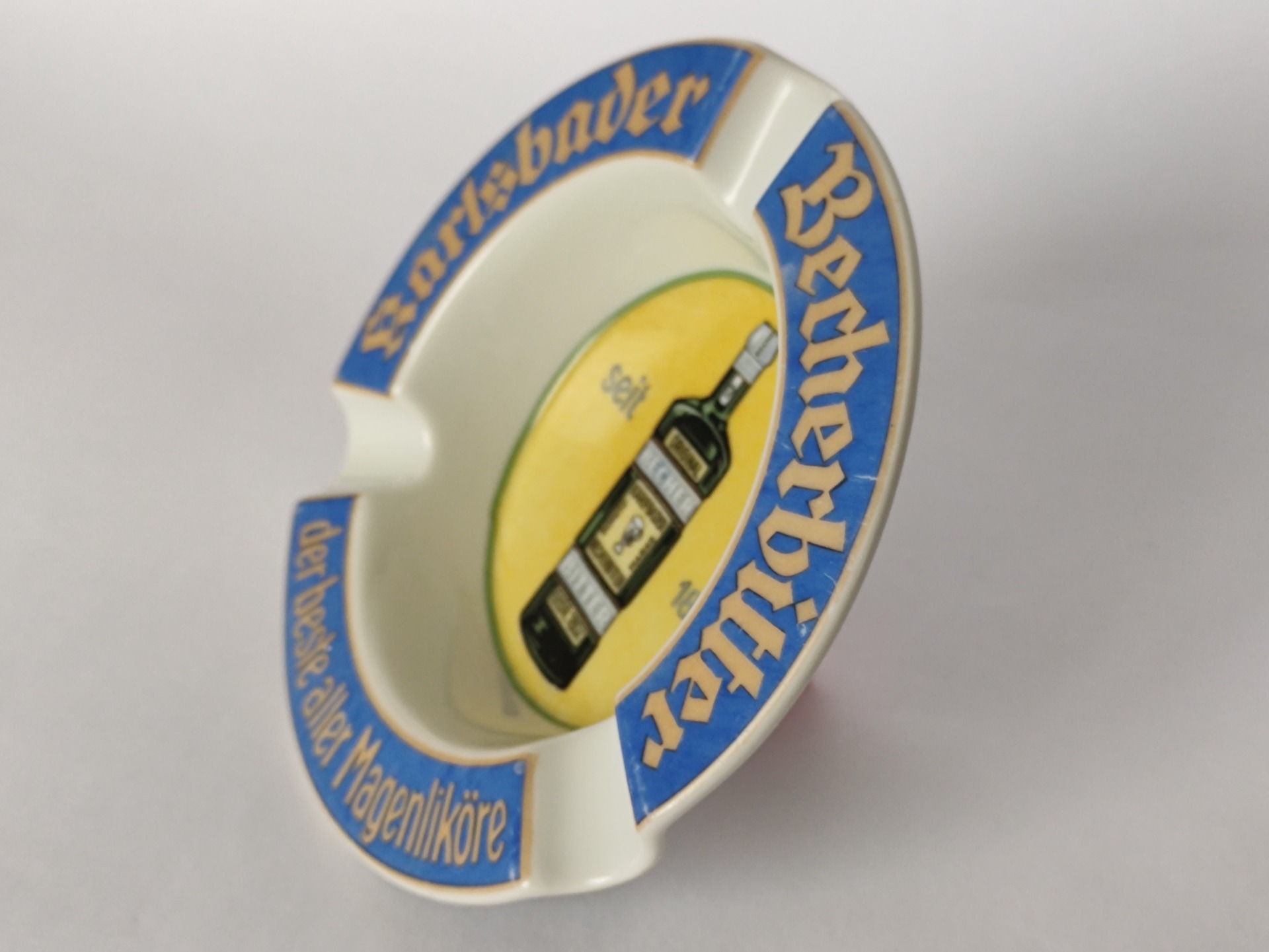 Stylový retro popelník s motivem legendárního bylinného likéru Becherovka z Karlových Varů. Tento originální reklamní kousek z dob Československa zaujme výrazným barevným provedením i typickým nápisem „Karlsbader Becherbitter“.