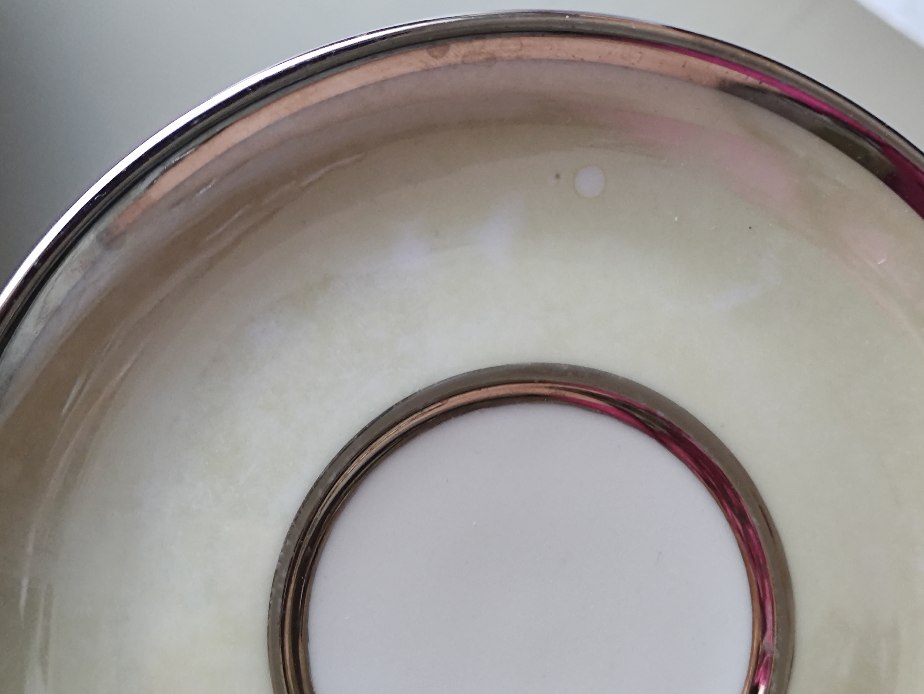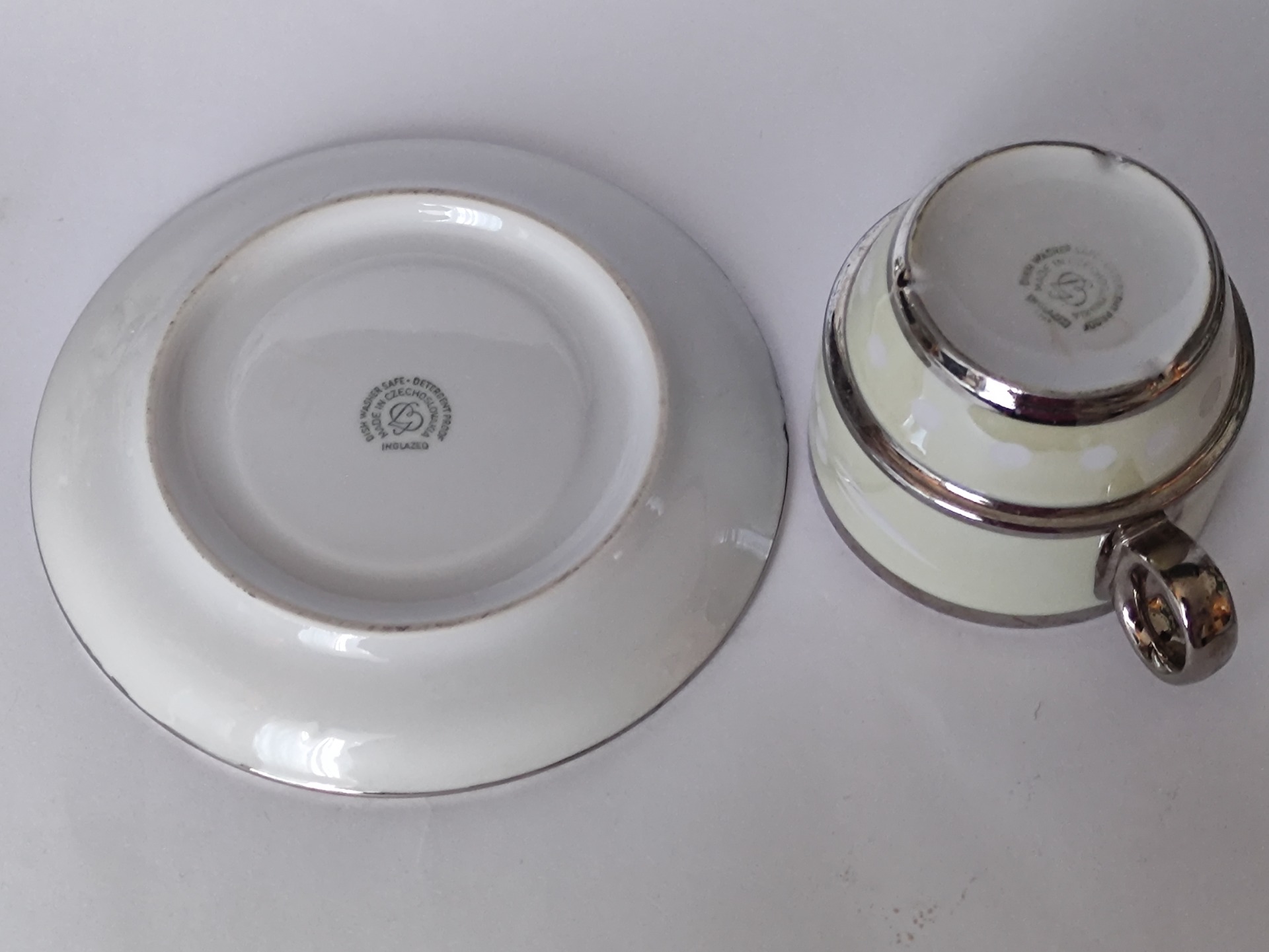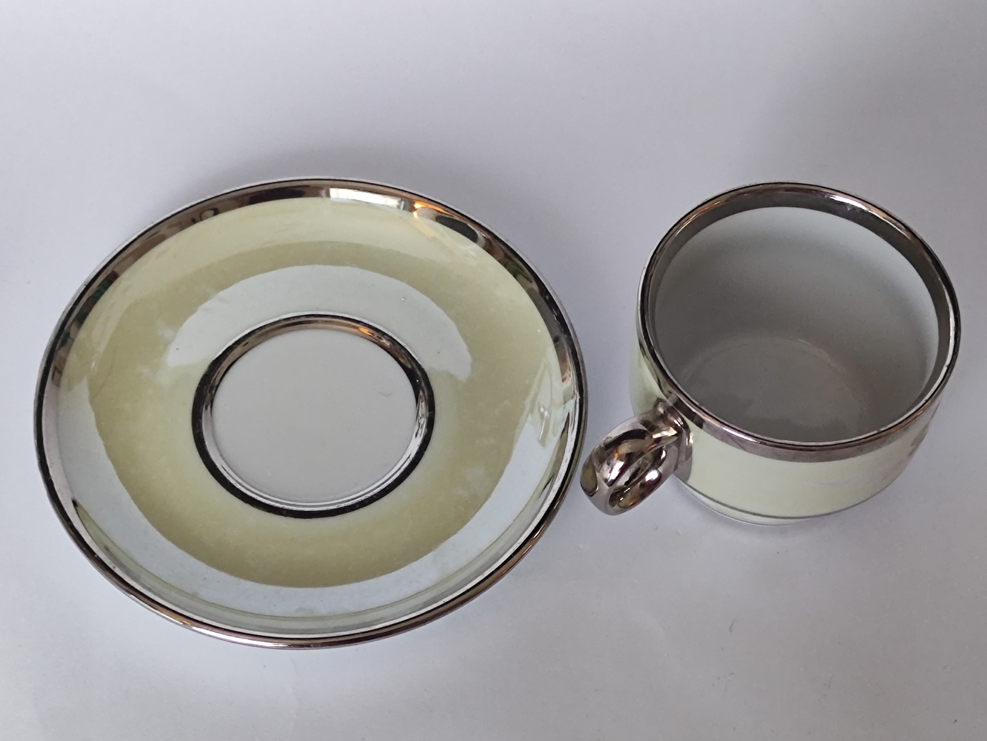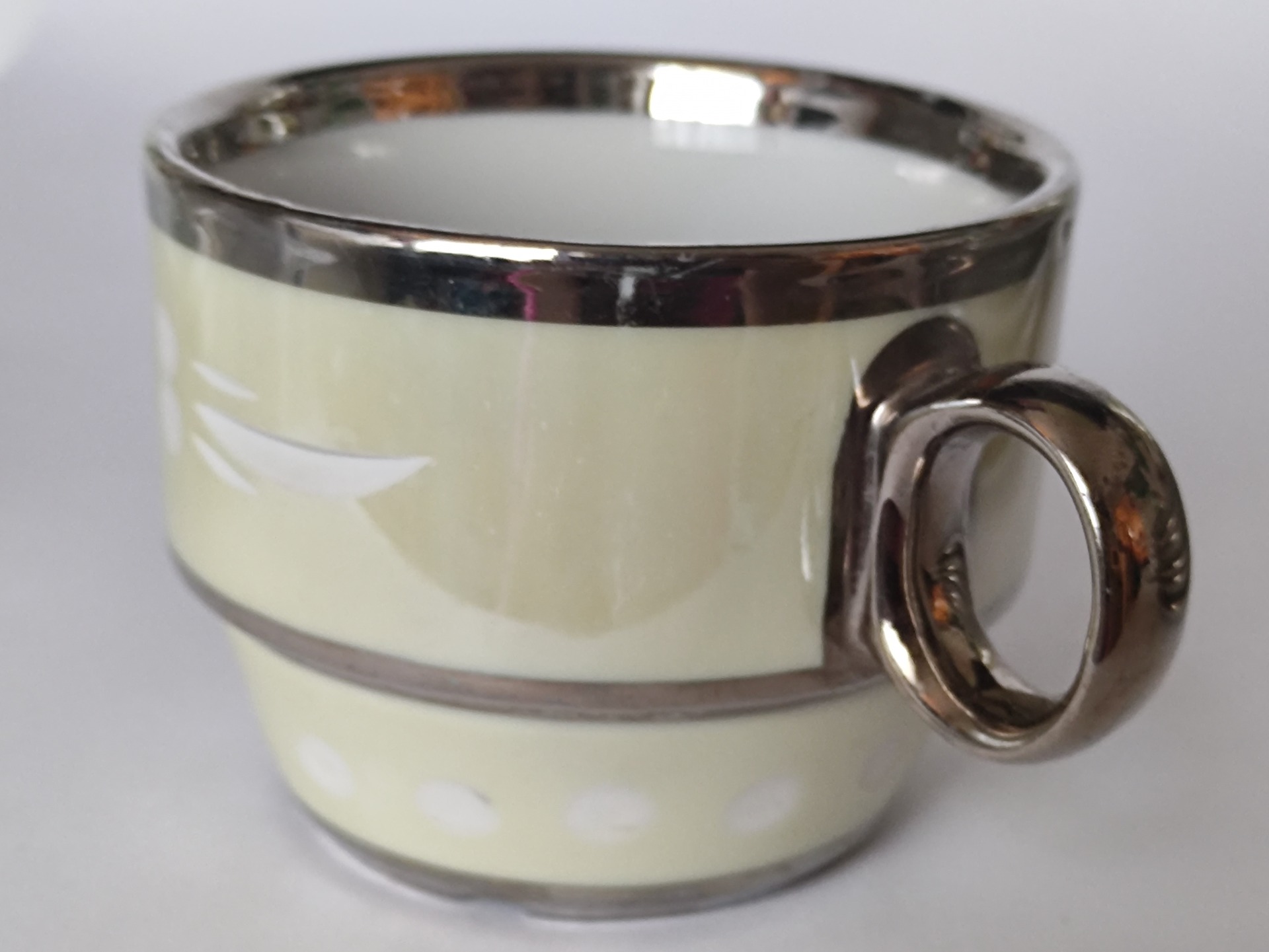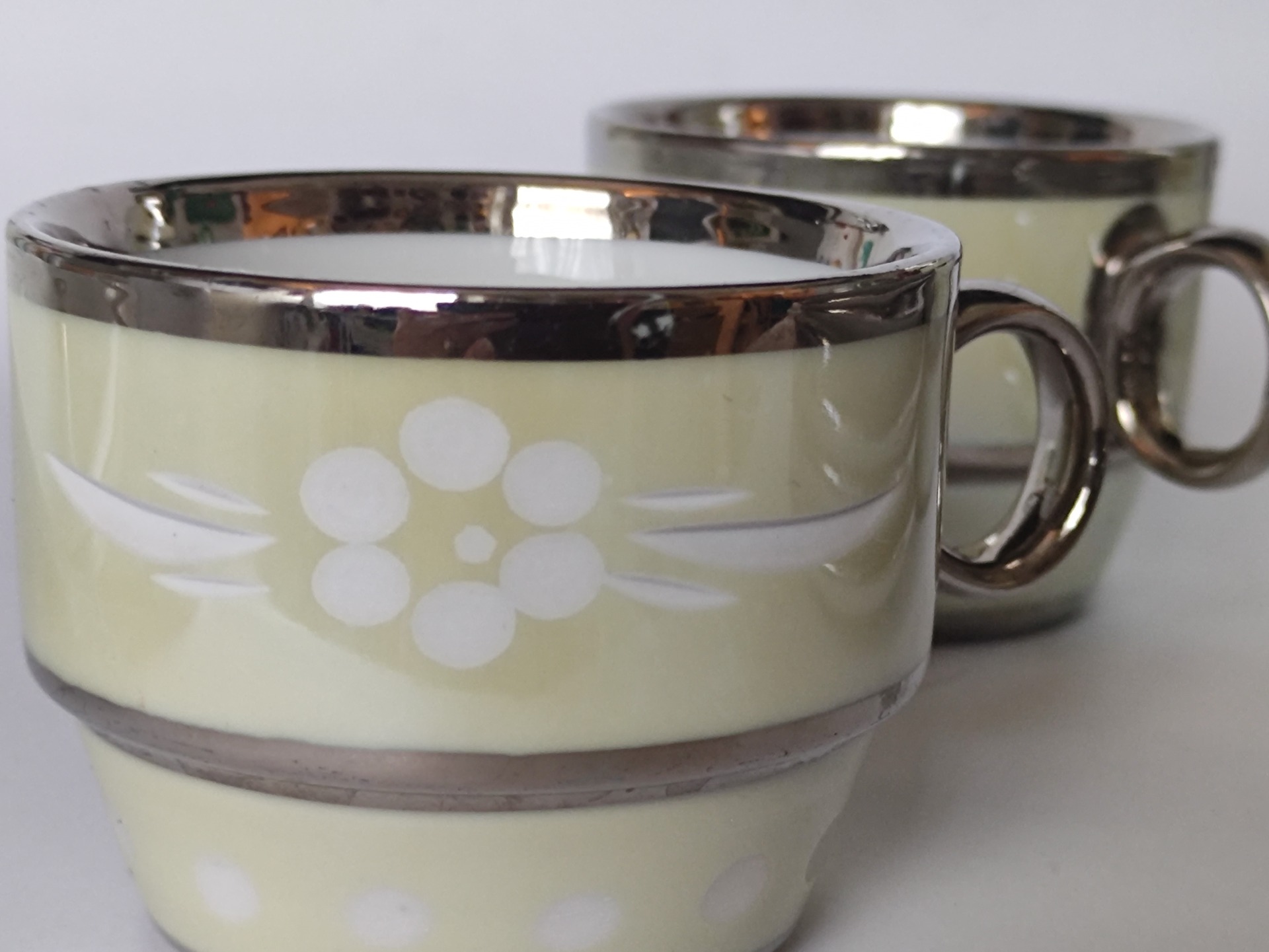 Retro šálky s podšálkem jsou plně funkční. Jemné známky stáří jim dodávají kouzlo a příběh. K dispozici je více kusů, všechny v podobném stavu, bez otluků či odštěpků, s místy opotřebenou barvou. Uvnitř jsou šálky krásně zachovalé.