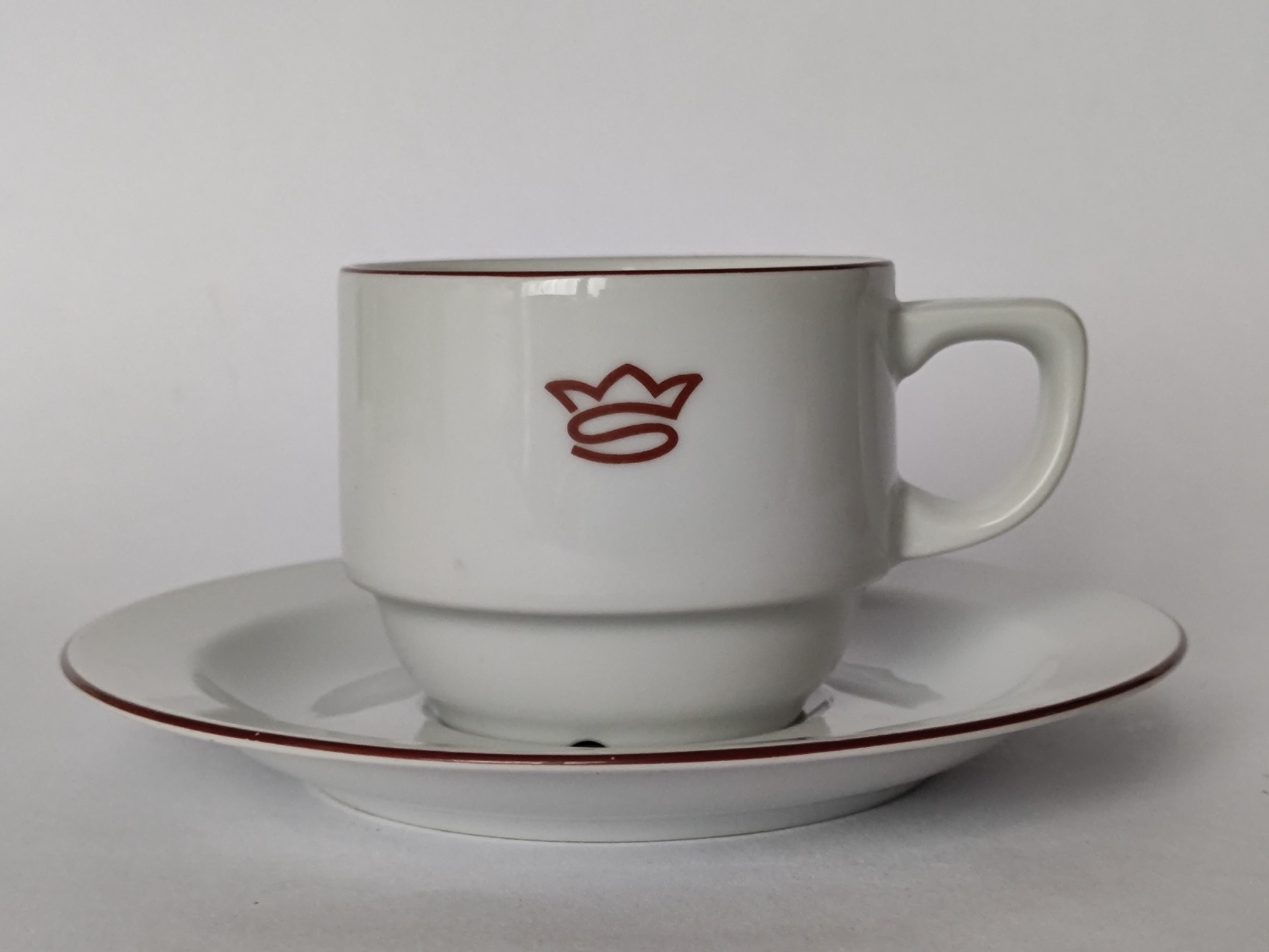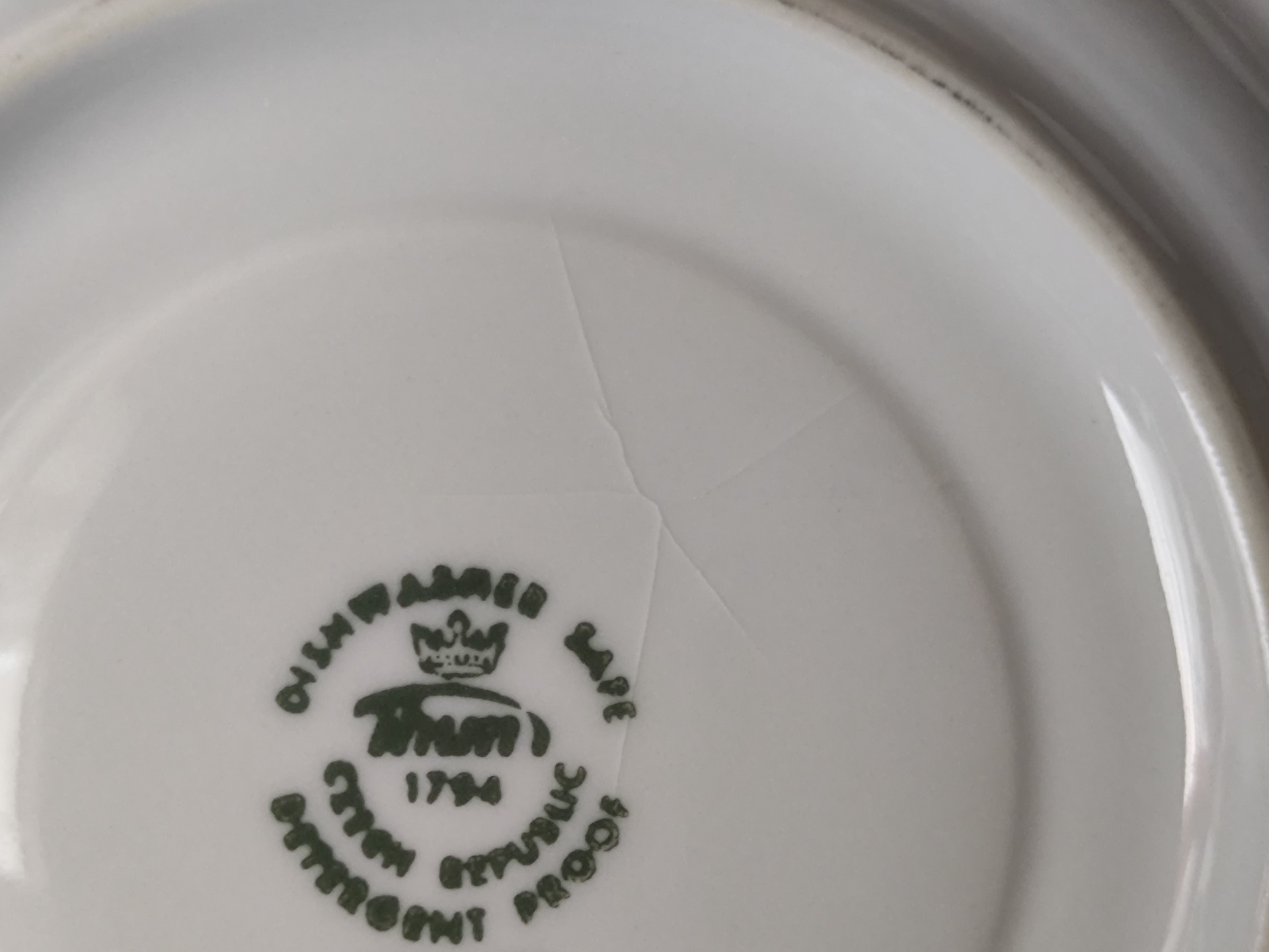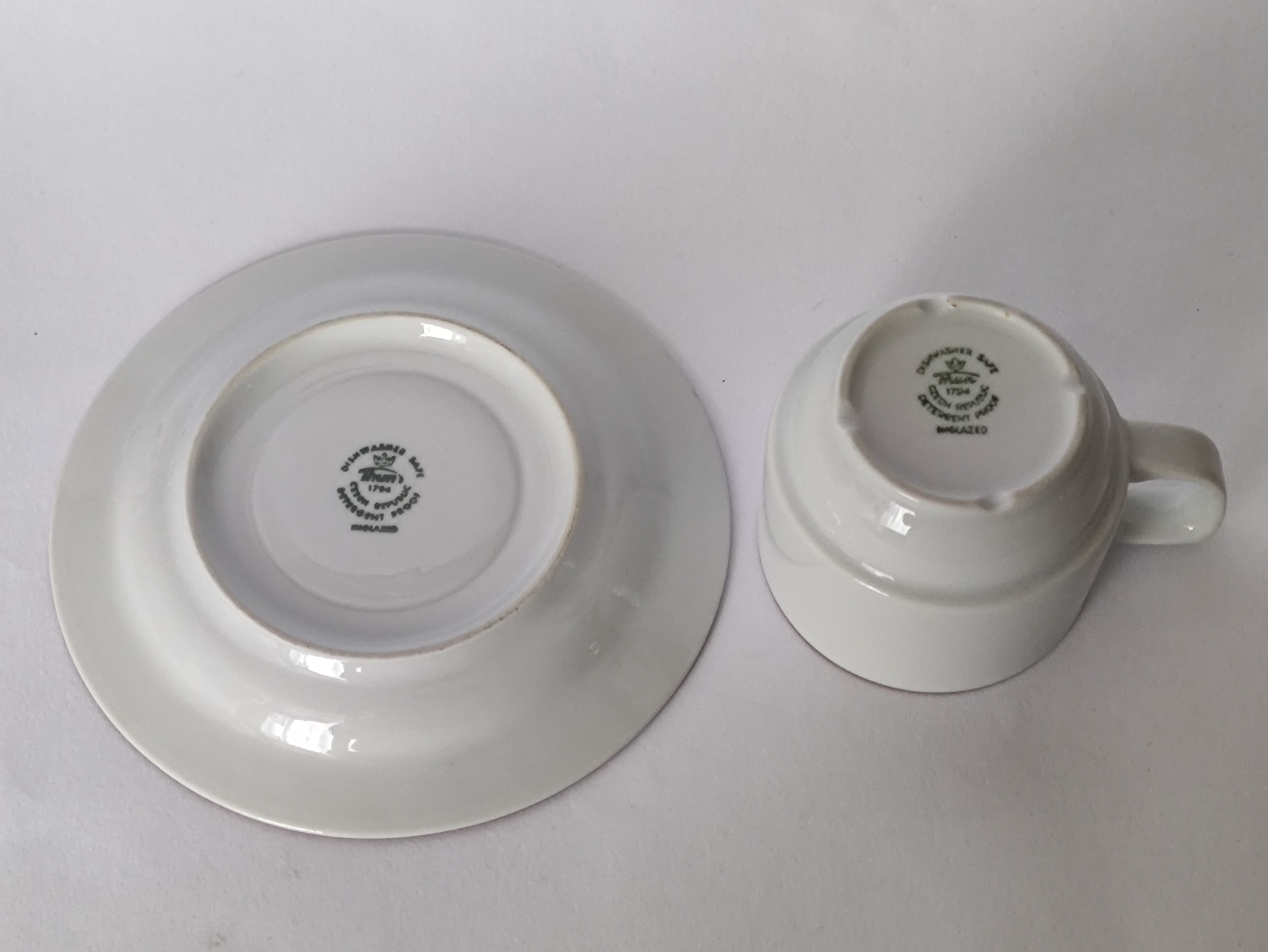 Originální šálek s podšálkem značený Thun Czech Republic. Podšálek nese známky stáří - malé hladké poškození na hraně a ze spodní strany povrchová prasklinka, viz poslední detailní fotky. Oba nedostatky téměř nejsou patrné a na funkčnost nemají vliv.
