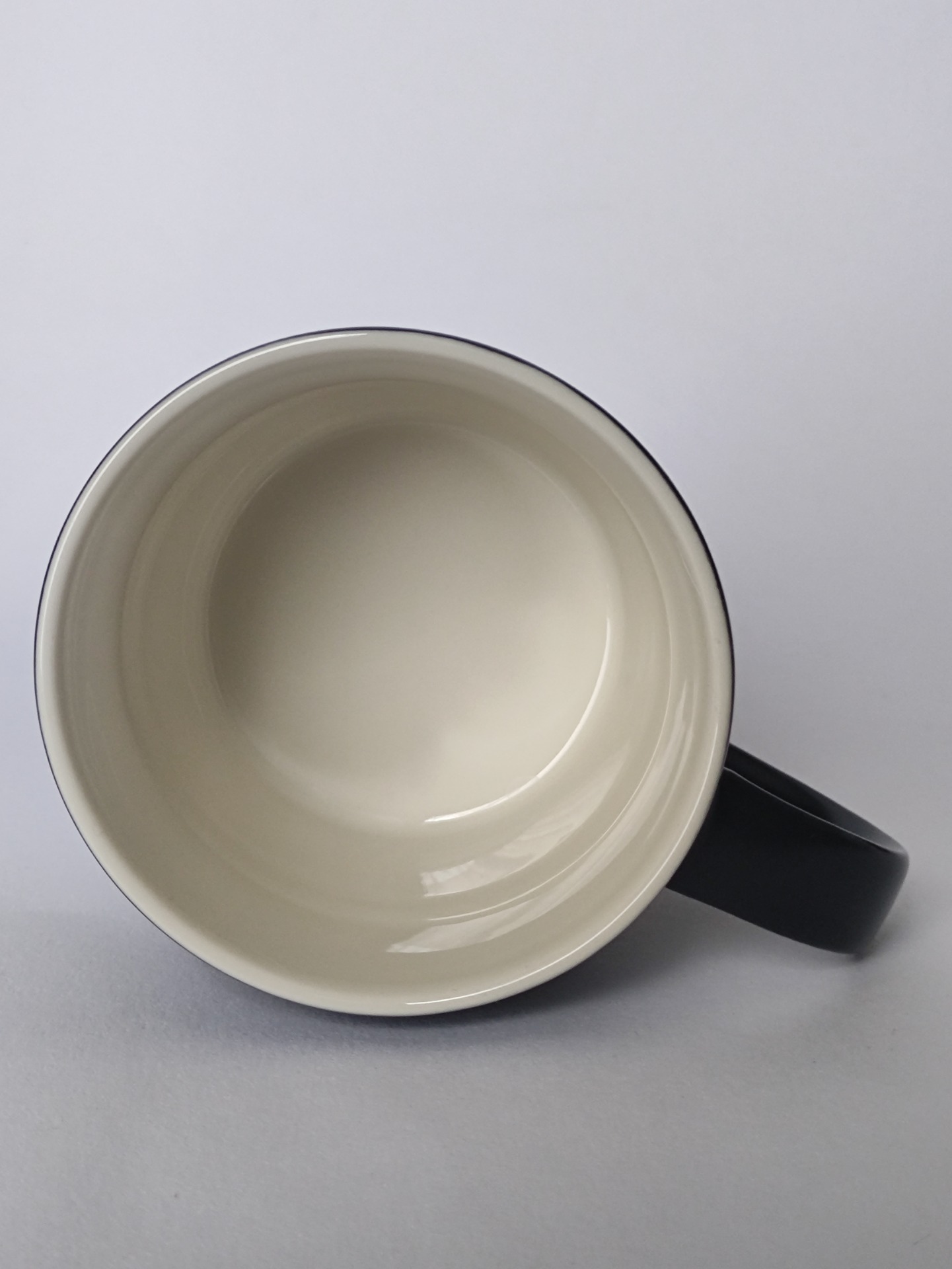 Hrnek má minimalistický design v matné černé barvě doplněný symbolem hvězdy a písmena R.